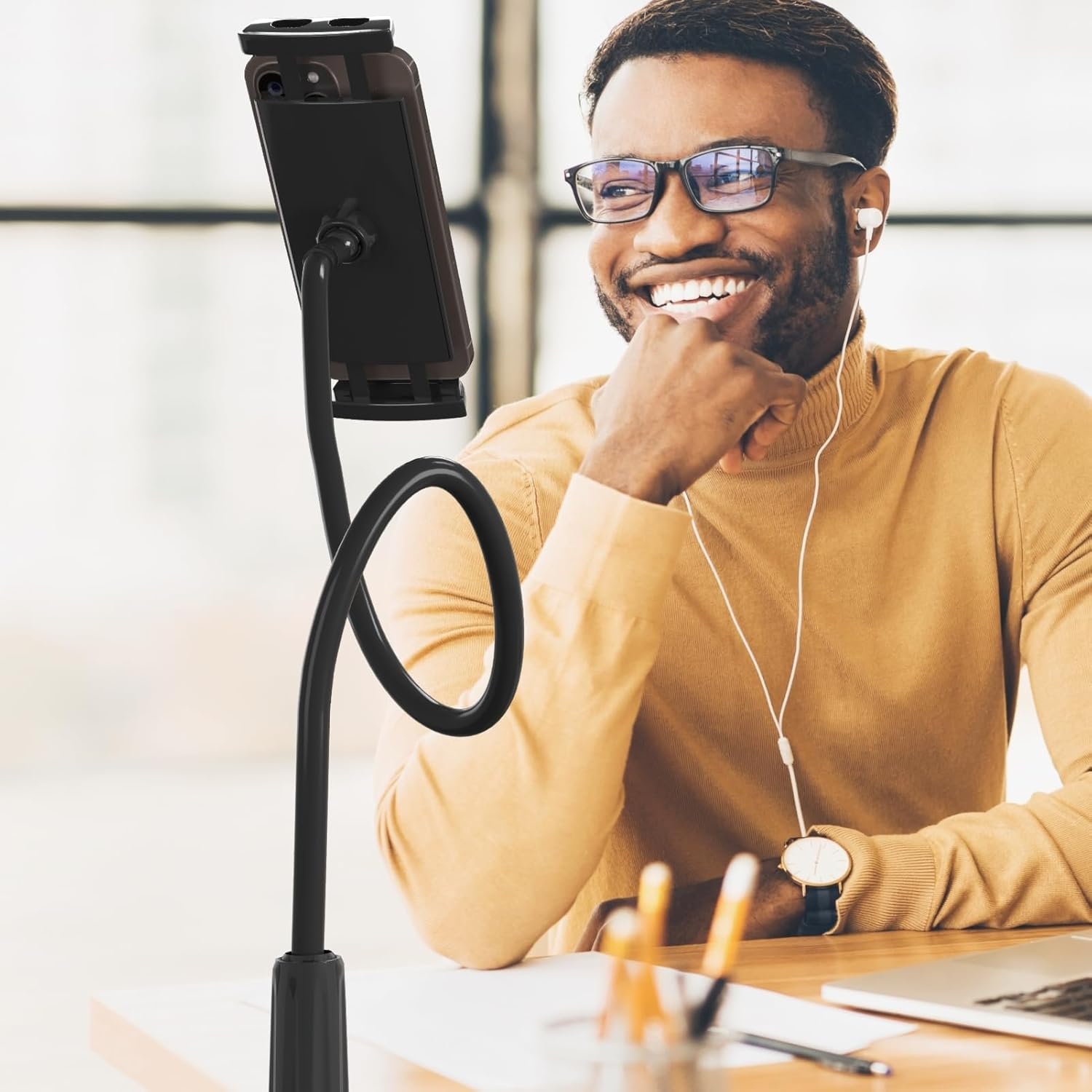 - CELLPHONE STAND DESIGN: Our phone holder boasts a unique design with a long, flexible gooseneck and a robust clamp, offering unparalleled adjustability in height and distance. Unlike regular mobile stands, this stand allows personalized positioning to meet your specific needs. The sturdy clamp ensures unmatched stability, safety, and convenience, providing a reliable solution for hands-free phone usage. Experience the flexibility and reliability of our adjustable cellphone stand.