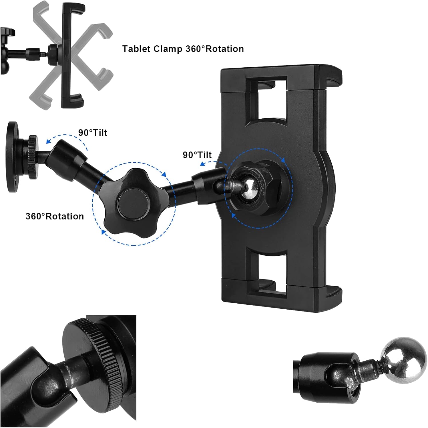 - 【Angle Adjustable】: Allowing to each end two ball heads 90°tilt freedom by twisting joint knob of tablet arm,also lock the joint knob to keep ball tighten and not loosen, twisting tablet clamp can 360°rotation flexible,easy to capture best viewings of tablet.