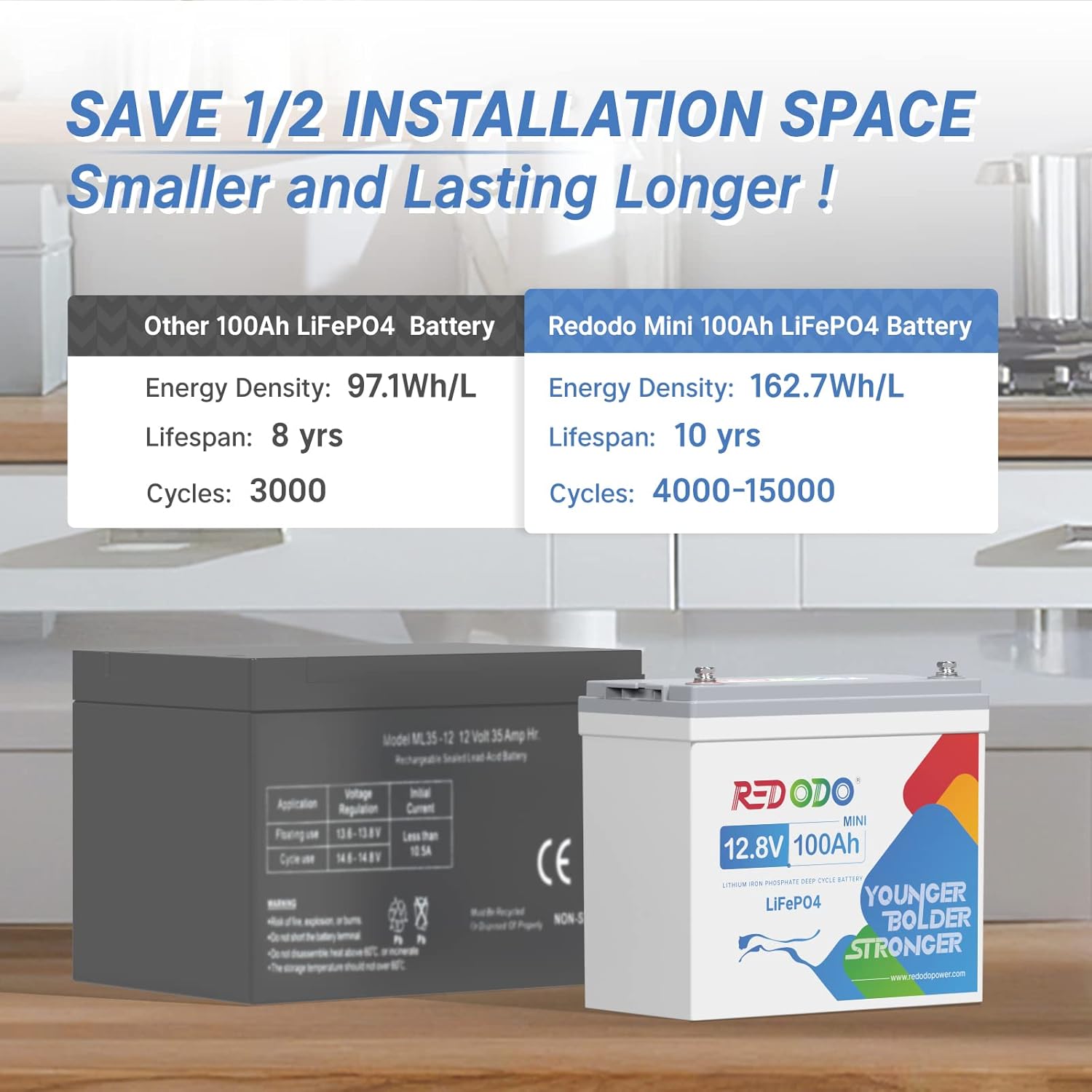 - 【35% Smaller in Mini Size】Redodo 12.8V 100Ah LiFePO4 battery MINI measures in 10.23x5.23x8.95 inches, which is 35% smaller compared to 12V 100Ah group 31 battery, 14% smaller compared to 12.8V 100Ah group 24 battery. Ultra compact design for the 100Ah mini lithium battery make you no more worries about the installation space.