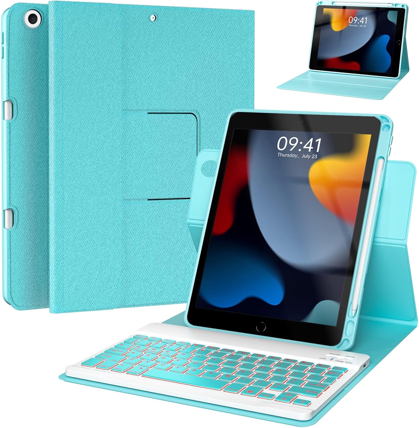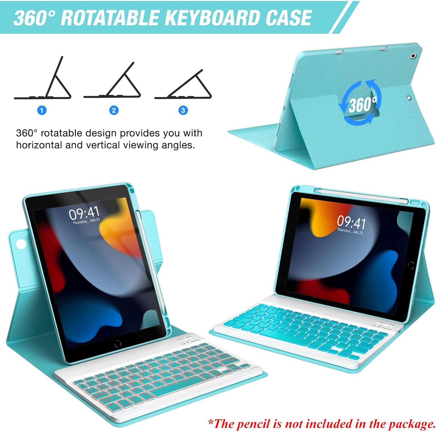 Keyboard Case for iPad 9th/8th/7th Generation 10.2 inch,360° Rotatable iPad Air 3 Pro 10.5-inch Case with Pencil Holder(2021/2020/2019/2017),7 Color Backlit Bluetooth Keyboard Folio Cover (Lake Blue)