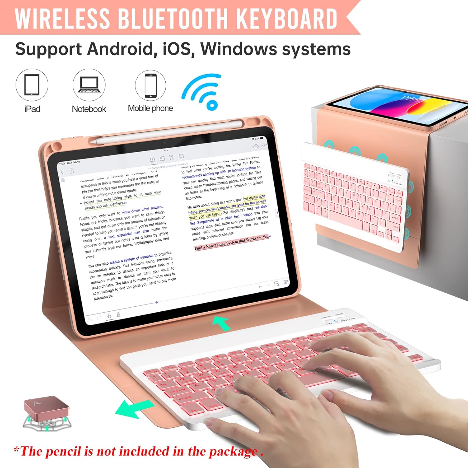 BLUTLOTUS Keyboard Case for iPad 10th Generation 2022 10.9 inch,360° Rotatable Keyboard Case with Pencil Holder, 7 Color Backlit Detachable Bluetooth Keyboard,Smart Folio Tablet Cover (Rose Gold)