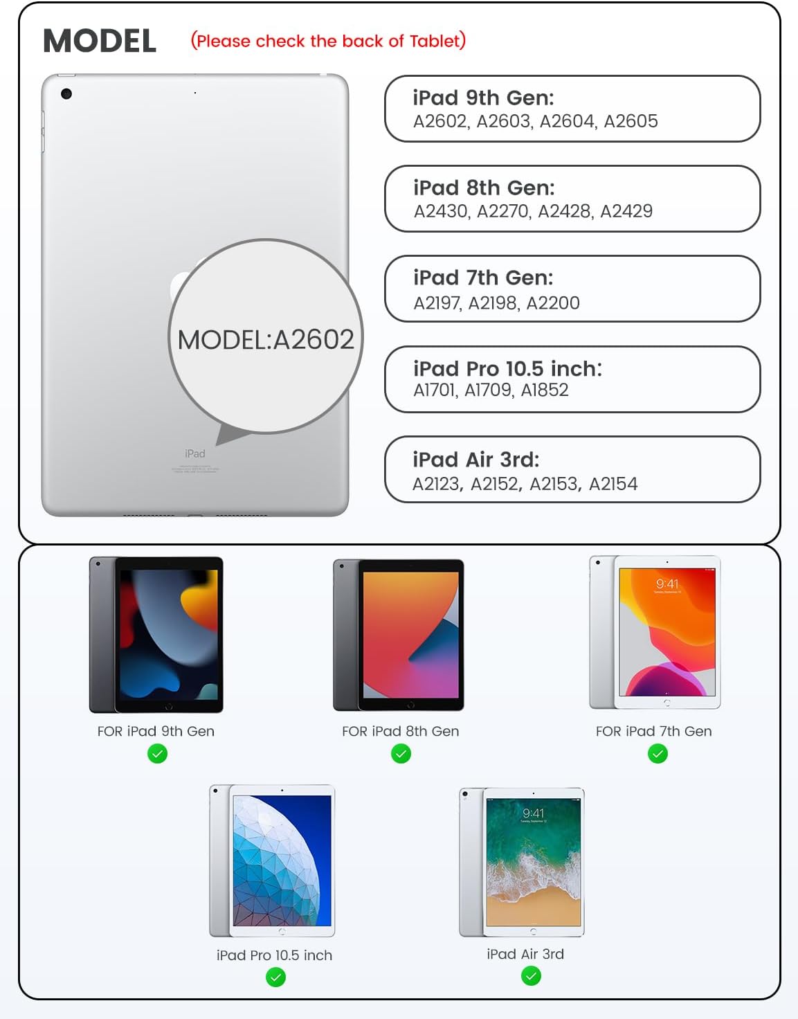 - 【iPad 9th Generation Case with Keyboard】Compatible Keyboard Case for iPad 9th Generation - A2602, A2603, A2604, A2605; Keyboard Case for iPad 8th Generation - A2430, A2270, A2428, A2429; Keyboard Case for iPad 7th Generation - A2197, A2198, A2200; iPad Pro 10.5 inch case with keyboard 2017 - A1701, A1709, A1852; iPad Air 3rd Generation - A2123, A2152, A2153, A2154 Note: Please check the bottom of the back of your iPad to confirm the model number "AXXXX" before purchasing to prevent size errors