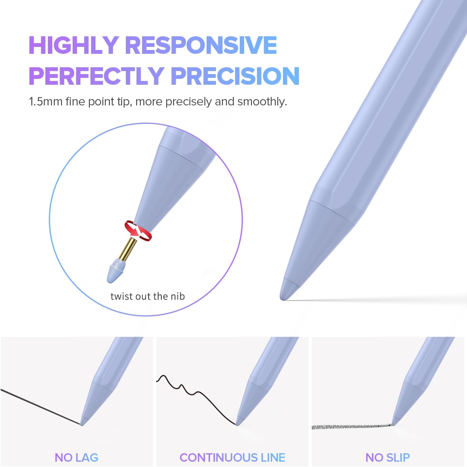 - 【Precise and Smooth】1.5mm pen tip can replace your finger to execute finer instructions, it easy to install and tear off the tips on your stylus pen without any tool. No lag/offset/breaking point!Compared with the ordinary stylus pen, it has higher sensitivity, more accurate signal, more comfortable hand. Not easy to break!【 Note 】The stylus pen no pressure-sensitive design