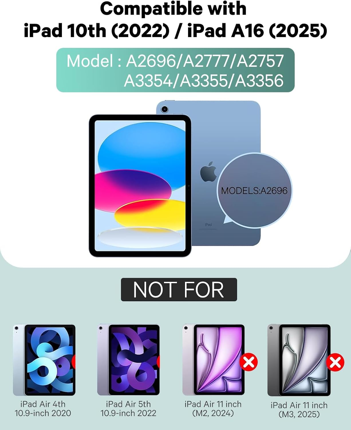 - 【Compatibility】 This wireless keyboard case is compatible with New iPad (A16) 11th Gen 11-inch 2025 (Models: A3354/A3355/A3356) and iPad 10th Gen 10.9 inch 2022 (Model Number: A2696/A2757/A2777). Please verify your tablet model carefully before purchasing. (iPad and pen not included)