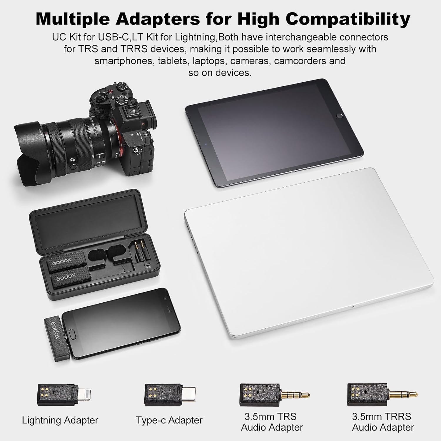 - 【High Compatibility】The MoveLink Mini has been designed into two versions, the MoveLink Mini UC Kit for USB Type-C, and MoveLink Mini LT Kit for lightning devices. Both of them have interchangeable connectors for TRS and TRRS devices, making it possible to work seamlessly with smartphones, tablets, laptops, cameras, camcorders and so on devices. Due to its extremely high compatibility, this mic system can be applied to vlogging, streaming, podcasting and any other content creation.