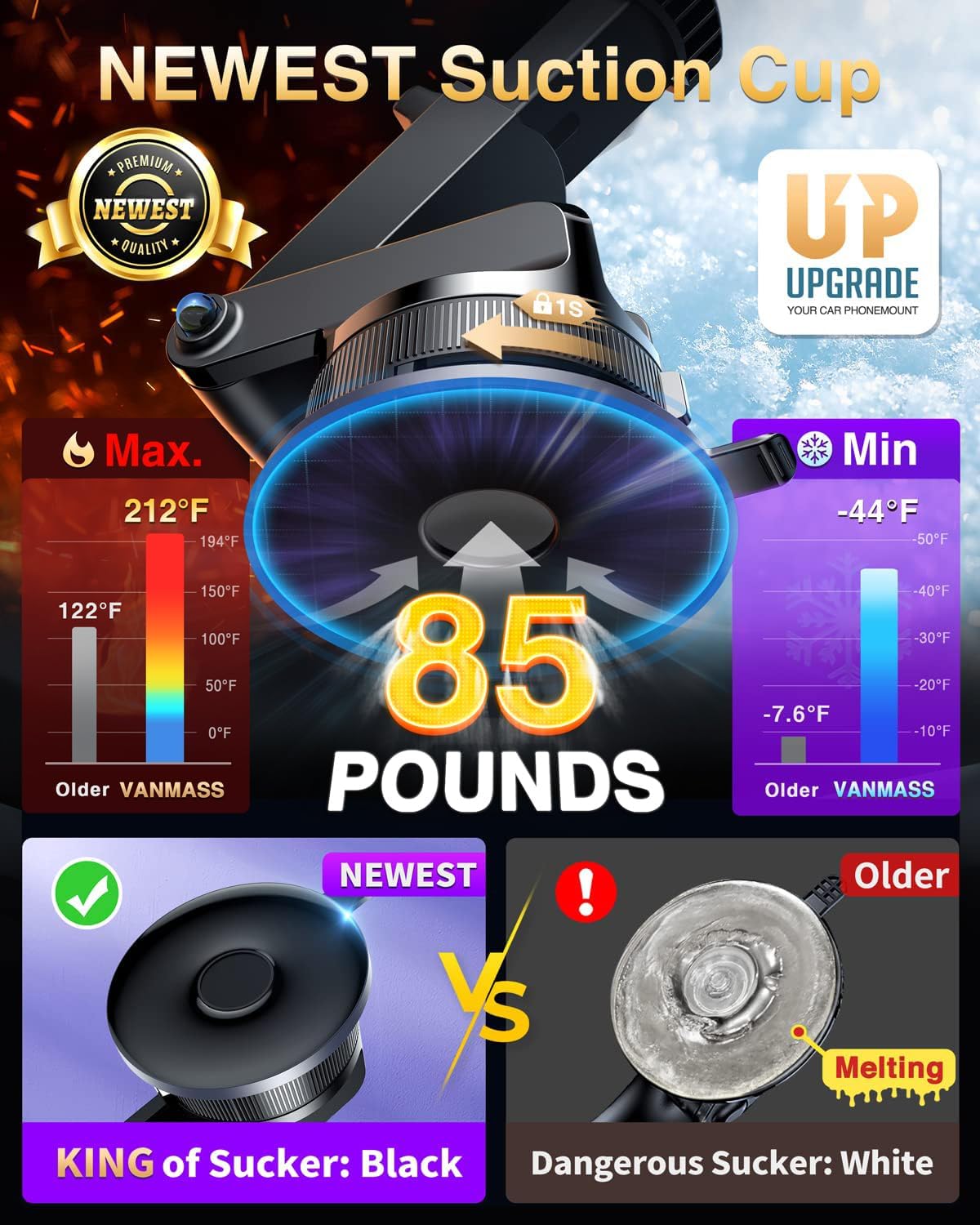 - 【Newest Rotary Mighty Suction Cup: Strongest Suction】Made of German materials, exclusive formula, one-piece molding rotary suction cup technology to ensure no melting or marks, UV and direct sun exposure resistance, -40~194℉,resistance. Maximize the adhesion of the suction cups to ensure the best results: 85LB Suction - 50% higher than the traditional. Based on 30,000+ times of 42-step procedure high precision tests, the rotary suction cup is superior to traditional press-on suction cup.