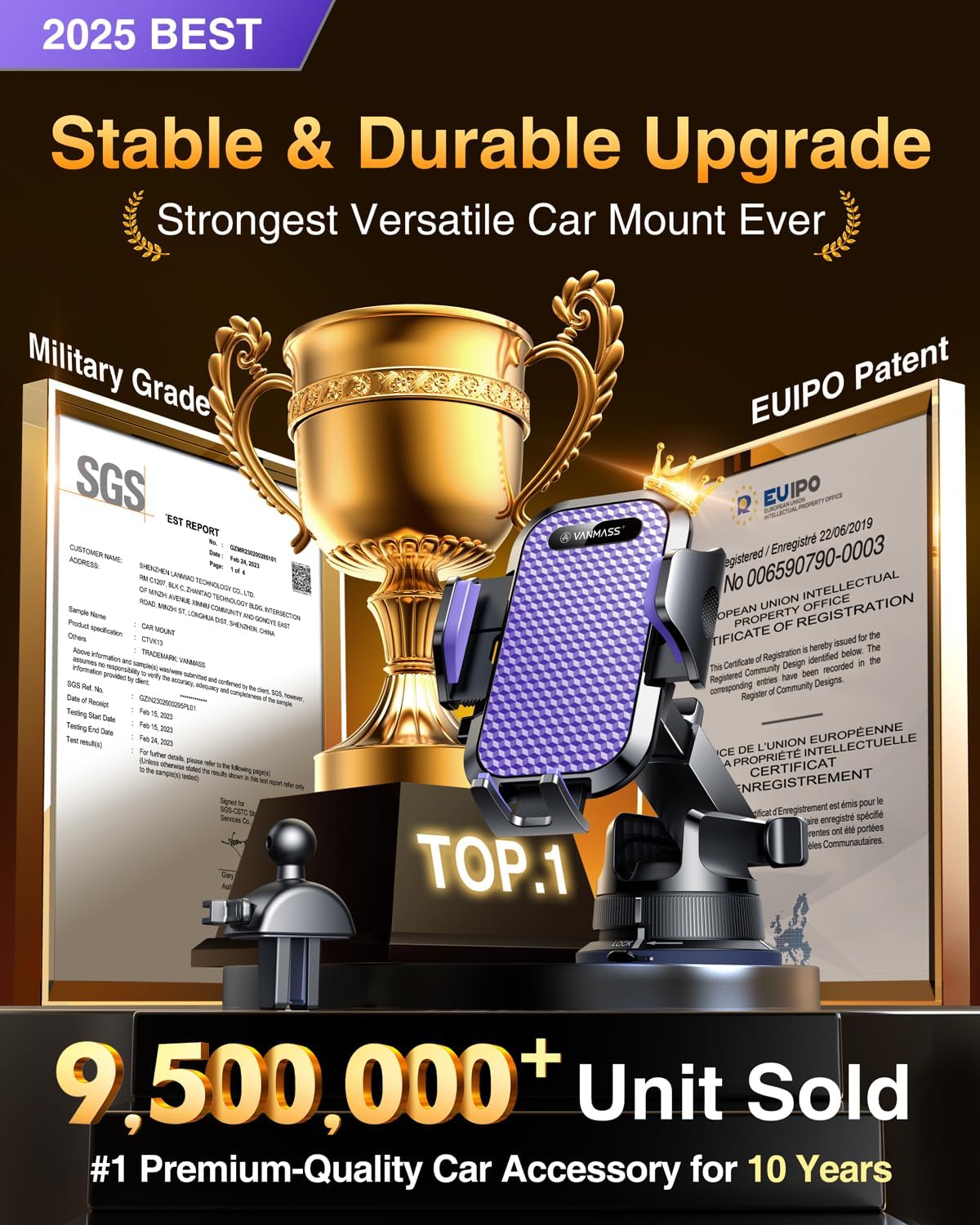 - 【Pro Version:VANMASS's Best Choice】VANMASS has been dedicated to car phone holder for 8 years, always leading the car holder industry in all aspects: safety, stability, durability, compatibility, multi-scene adaptability,climate friendly. The pro version mount enables the cutting-edge design team to create the best choice for customers- highest rating, most customers' preference, EU Intellectual Property Patent (No.007708805-0001), Military Grade Cert (No.GZMR220601855501), CP65/REACH/ROHS