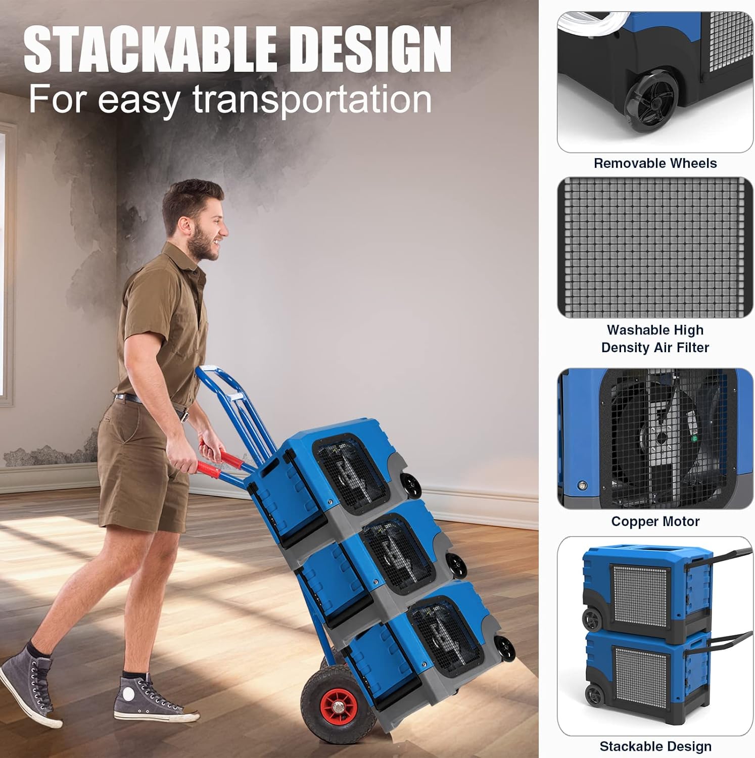 - Comes back after power failure, no need to turn on manually, this water damage Restoration dehumidifier designed with Rigid handle and semi-pneumatic wheels to facilitate transport.