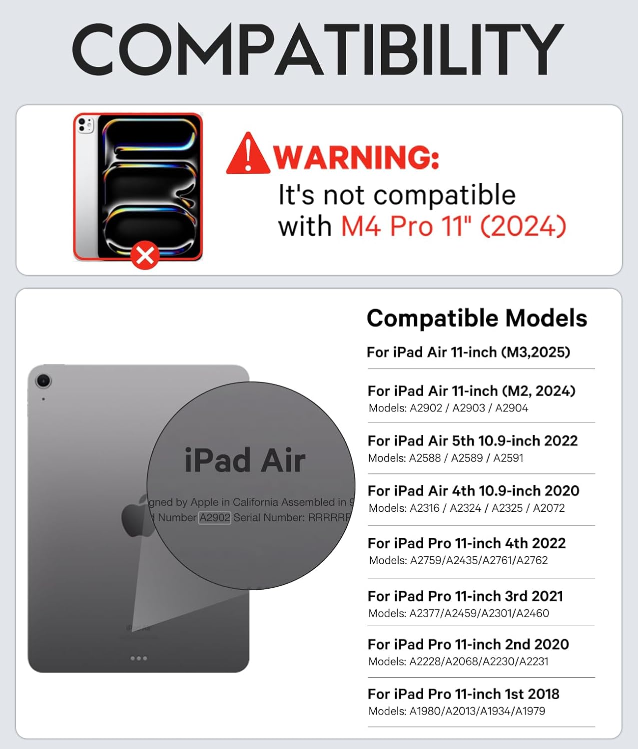 - Compatible Devices : iPad Air 11 inch (M3/M2) 2025/2024, iPad Air 5/4th Gen., iPad Pro 11" 4th/3rd/2nd/1st Gen.(Not for Pro 11" M4 2024) iPad Air 11 inch (M3/M2) 2025/2024, iPad Air 5/4th Gen., iPad Pro 11" 4th/3rd/2nd/1st Gen.(Not for Pro 11" M4 2024)