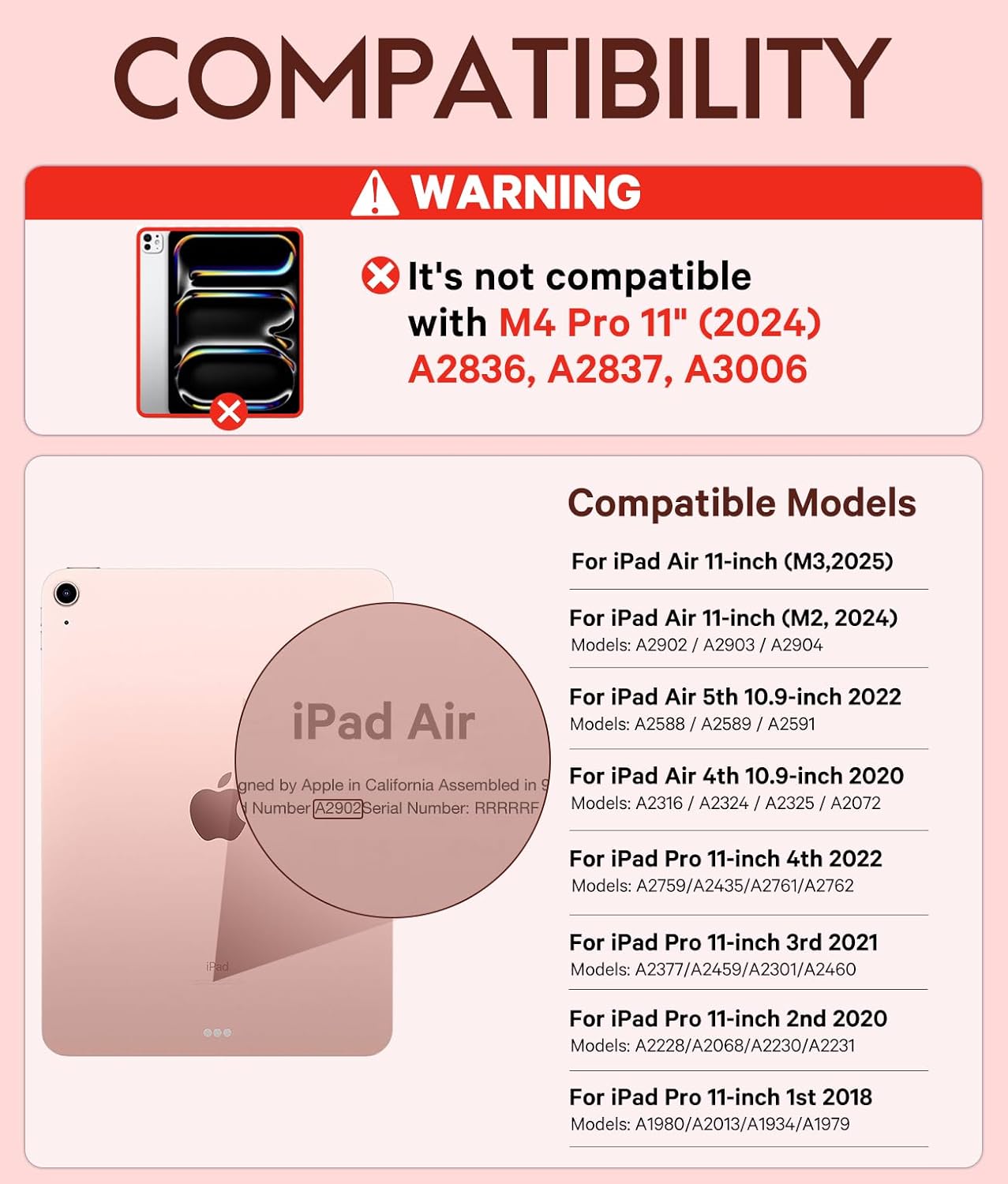 - Compatible Devices : iPad Air 11 inch (M3/M2) 2025/2024, iPad Pro 11" 4th/3rd/2nd/1st Gen.(Not for Pro 11" M4 2024) iPad Air 11 inch (M3/M2) 2025/2024, iPad Pro 11" 4th/3rd/2nd/1st Gen.(Not for Pro 11" M4 2024)