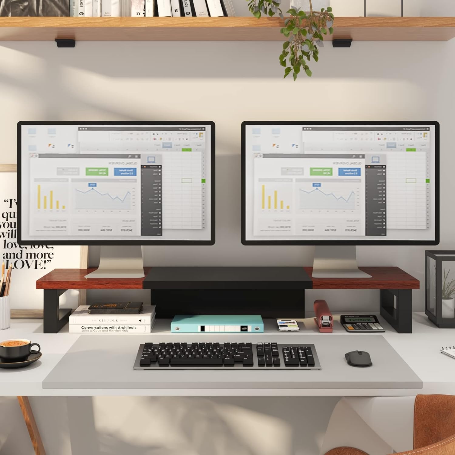WESTREE Dual Monitor Stand Riser, Wood and Steel Monitor Stand Riser, Computer Monitor Stand for 2 Monitors, Multi-Purpose Desktop Storage Stand for Computer,Laptop,Printer,TV
