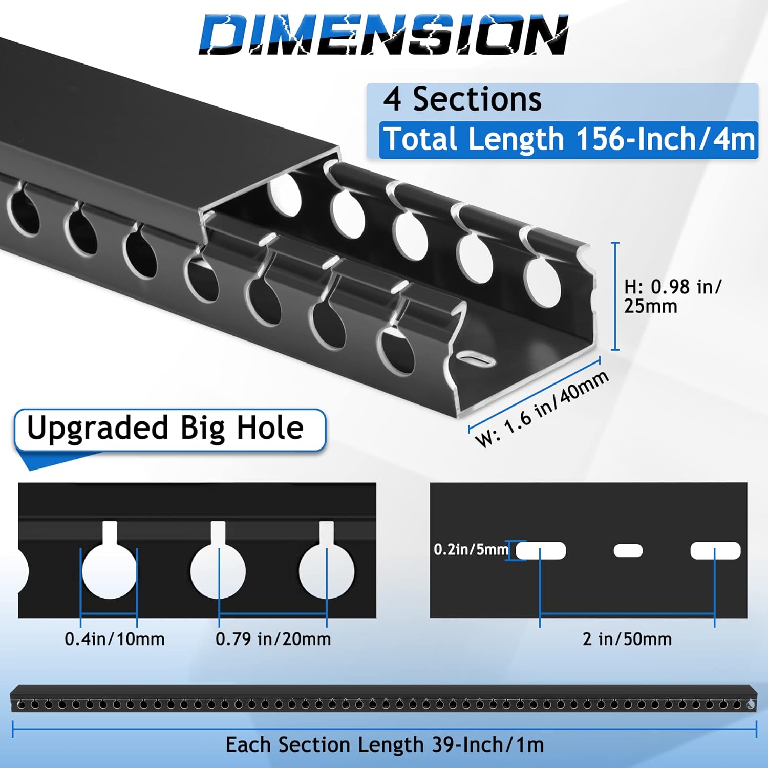 - Easily Manage Your Network and Data Cables: Designed with round upgrade openings on both sidewalls (D = 0.4 inch), through which 3-prong extension cables can be run through. Its H0.98 in x W1.6 in large capacity can accommodate up to 16 cables (depending on their thickness). This cable raceways kit brings four 39in long cable management raceway (Total 156in), reduce the hassle of splicing