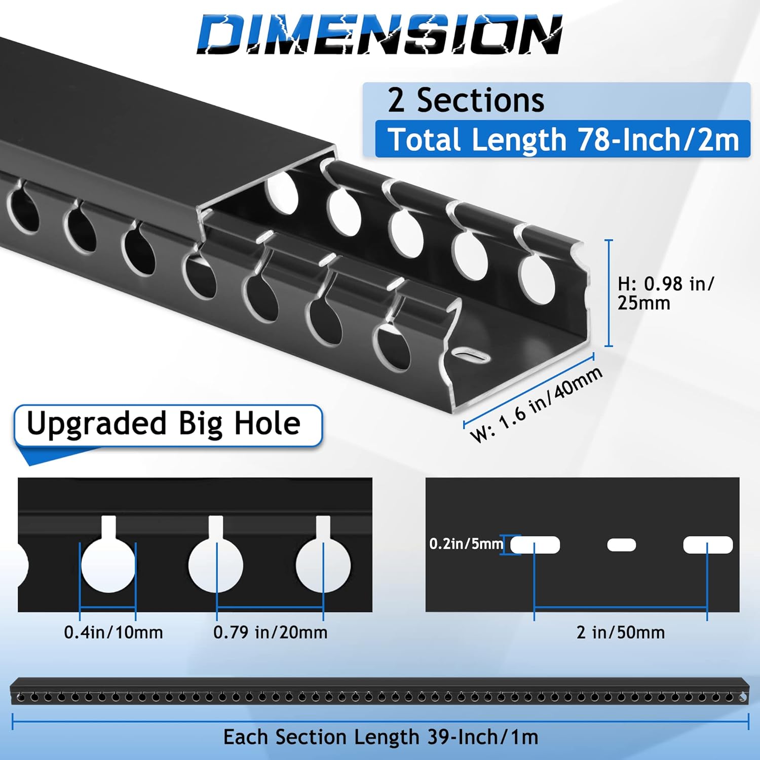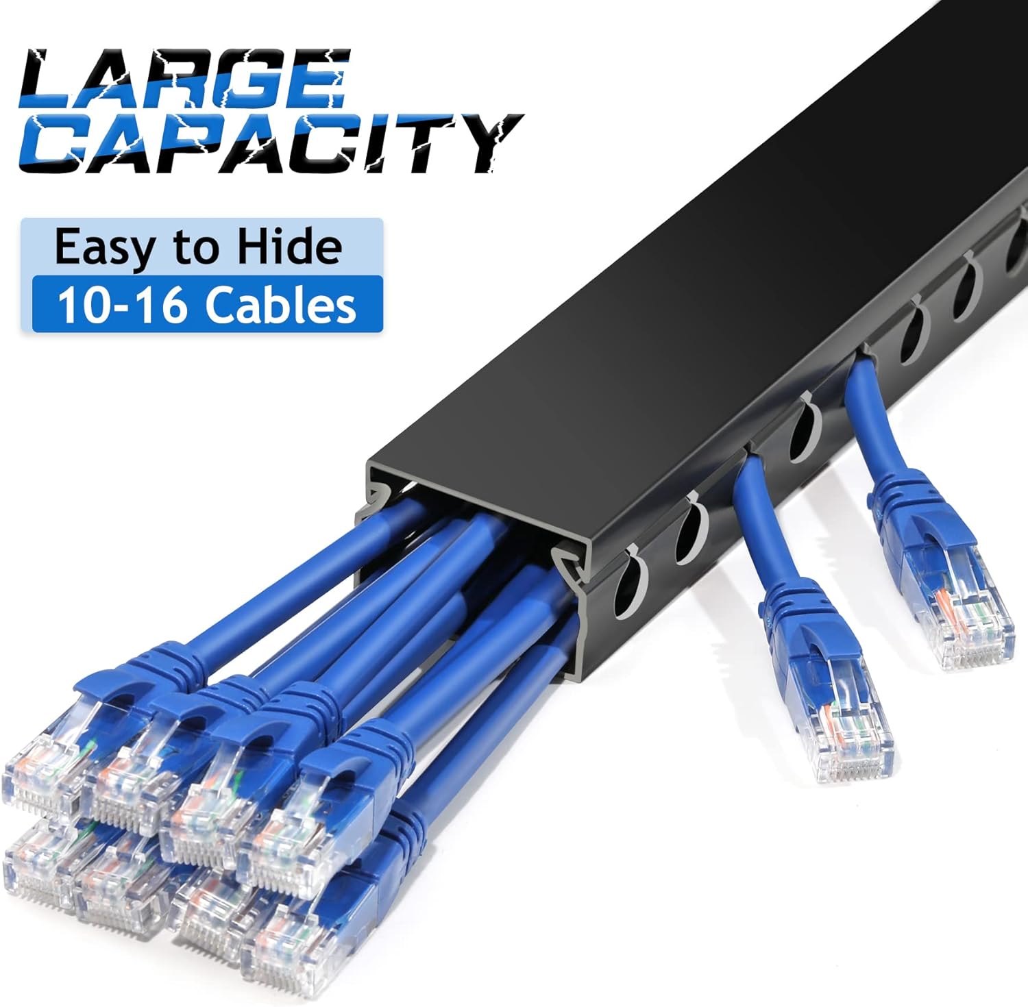 - Easily Manage Your Network and Data Cables: Designed with round upgrade openings on both sidewalls (D = 0.4 inch), through which 3-prong extension cables can be run through. Its H0.98 in x W1.6 in large capacity can accommodate up to 16 cables (depending on their thickness). This cable raceways kit brings two 39in long cable management raceway (Total 78in), reduce the hassle of splicing