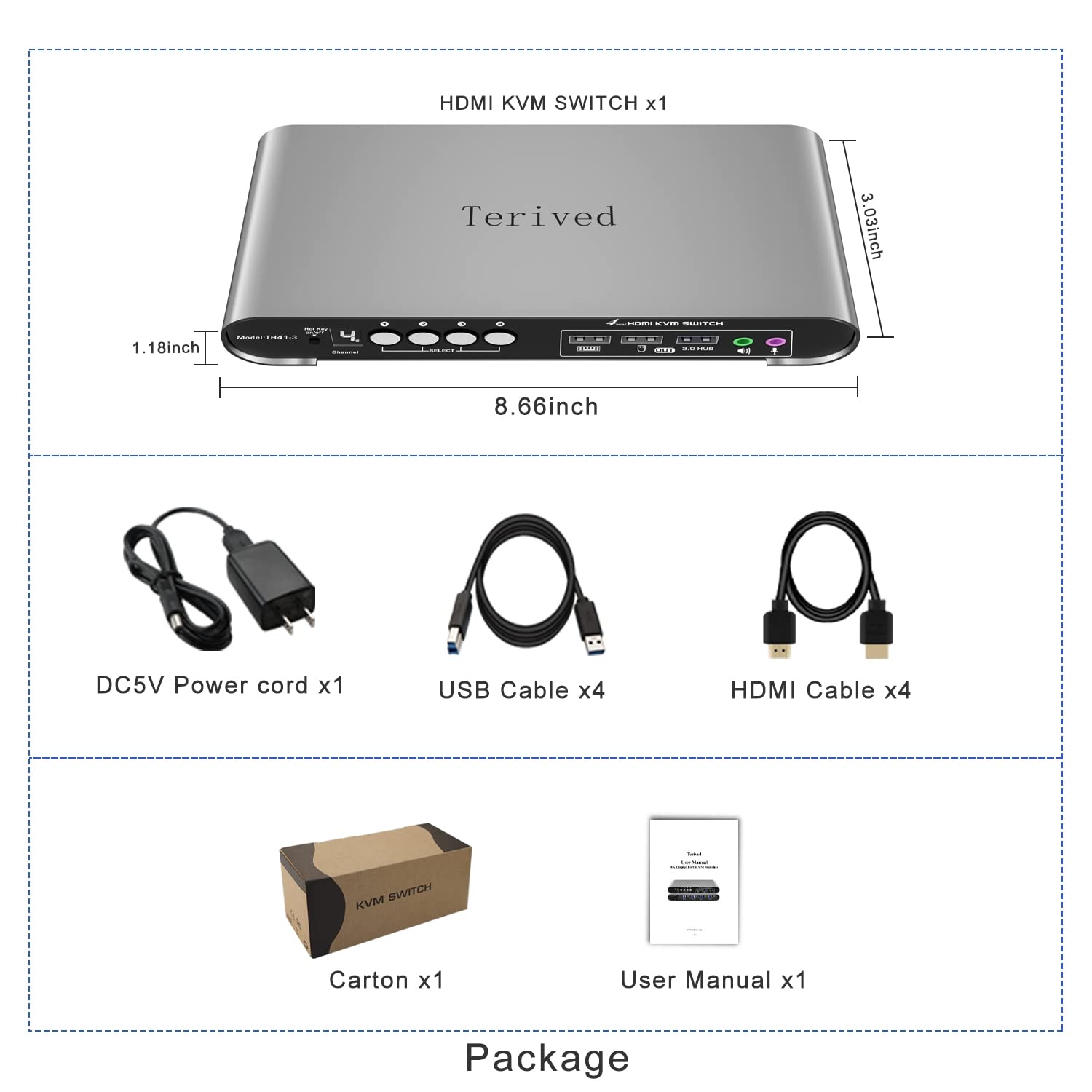 HDMI KVM Switch 4 in 1 Out with Hotkey Mouse Switching, Audio Mic Support, 4K@60Hz, USB 3.0 Hub, Digital Display, Terived Aluminum KVM with Cables Included