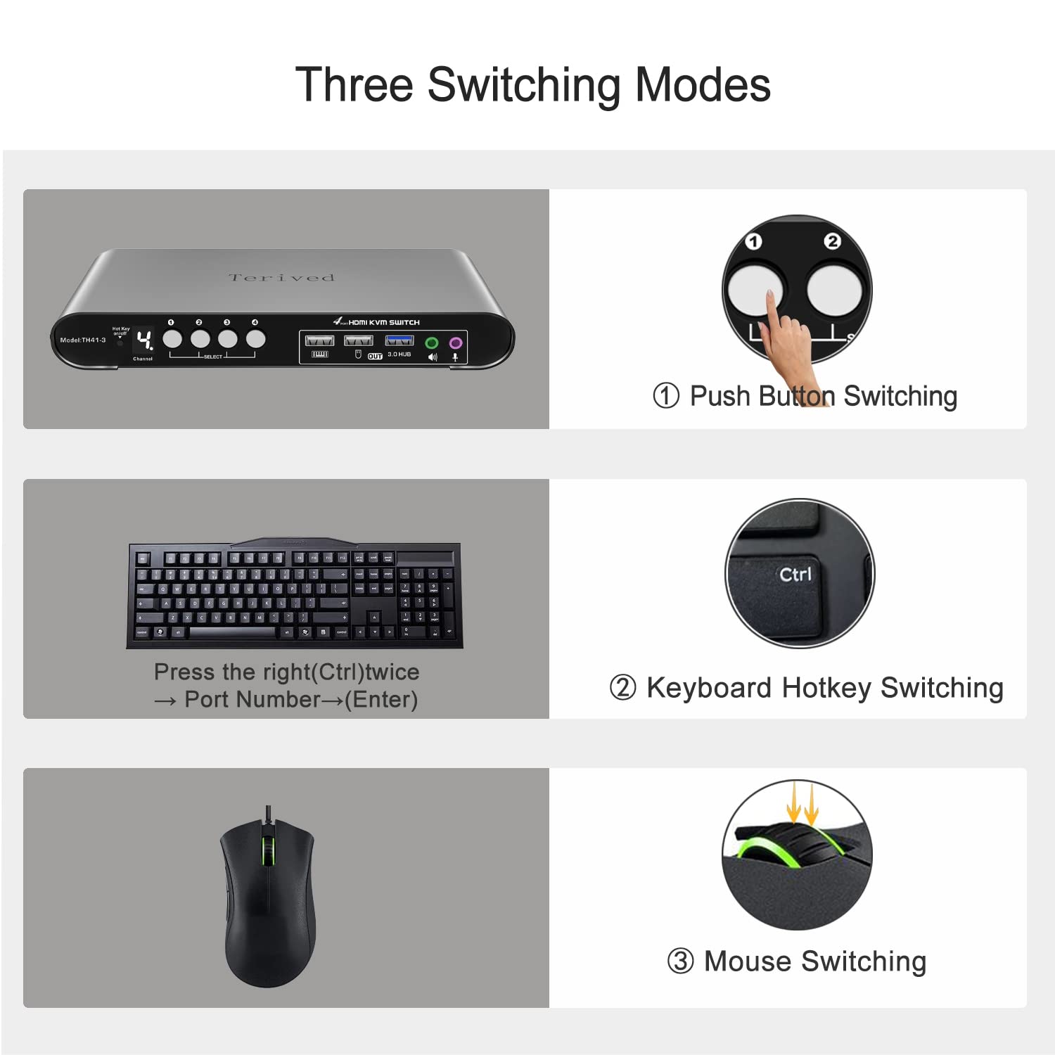 - Hotkey - Tired of a manual button switch? This product gives you a convenient way to switch with Keyboard shortcut: press the right [CTRL] key twice, then press [1, 2, 3, or 4], followed by [Enter] to choose a computer.