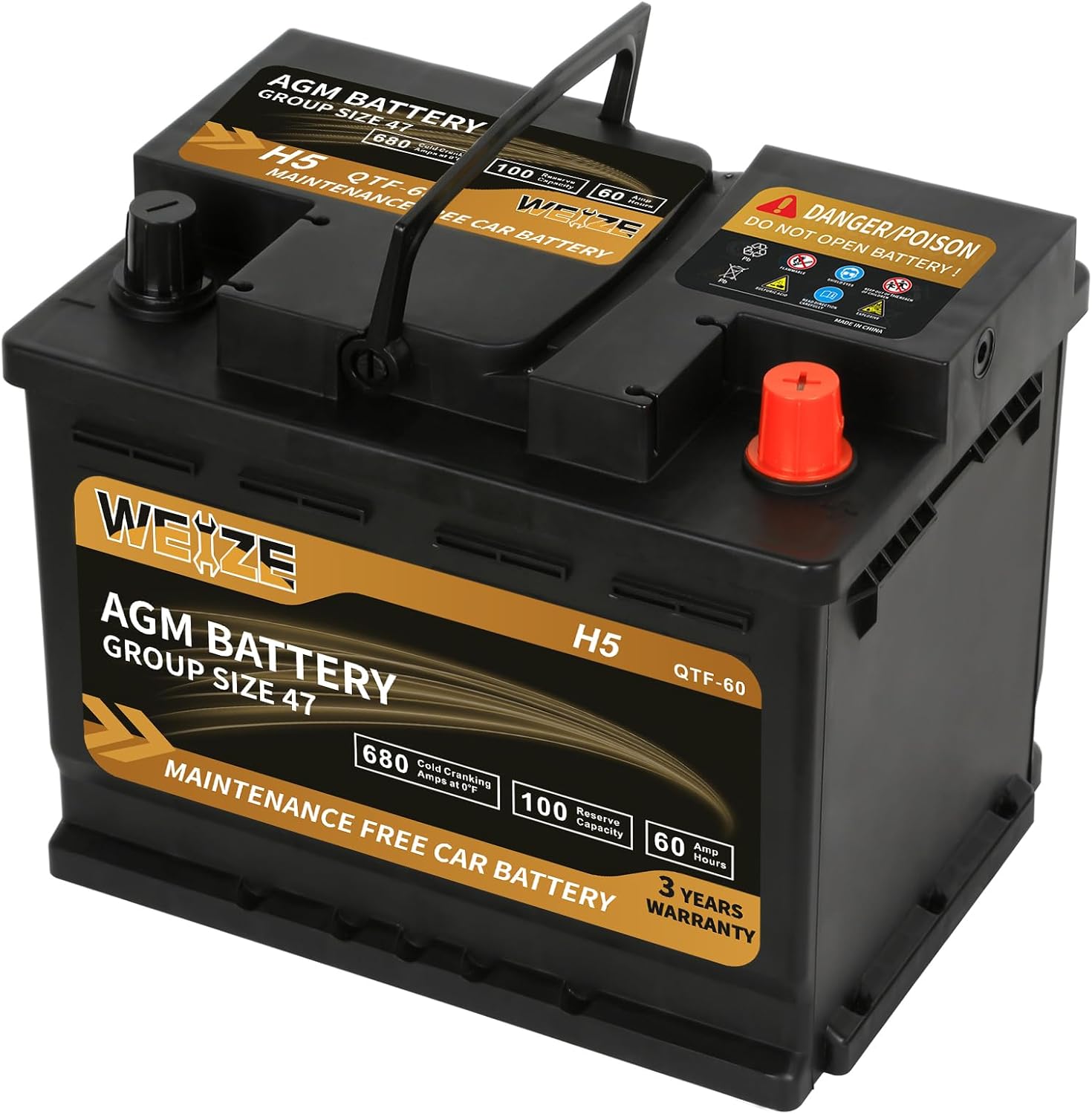 Weize Platinum AGM Battery BCI Group 47-12v 60ah H5 Size 47 Automotive Battery, 100RC, 680CCA, 36 Months Warranty, Dimensions 9.52" L x 6.89" W x 7.48" H