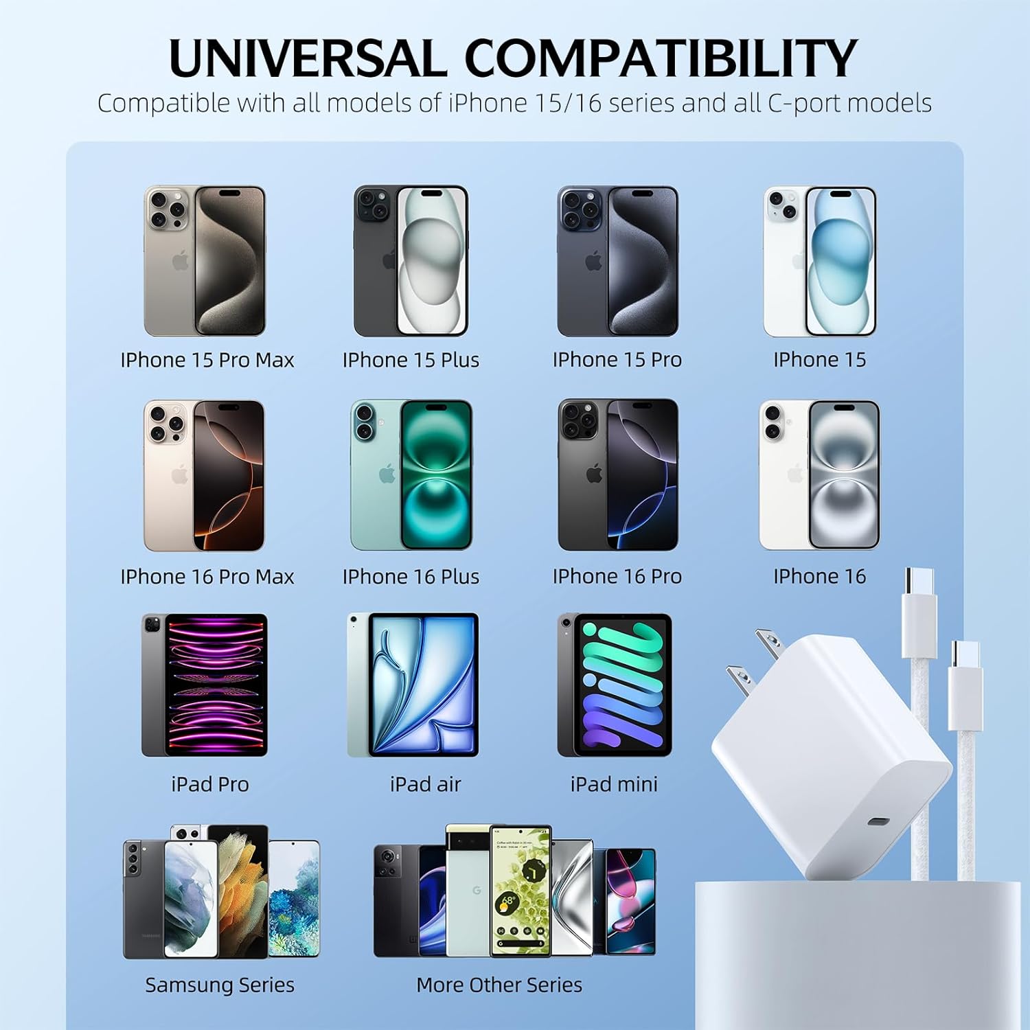 - 【iPhone 16 Pro Max Charger Universal Compatibility】Designed specifically for the iPhone 16 15 series, usb c charger is guaranteed to be fully compatible with iPhone 16/iPhone e/iPhone 16 Plus/ iPhone 16 Pro/ iPhone 16 Pro Max,iPhone 15/15 Plus/15 Pro/15 Pro Max, iPad 10th Gen,iPad mini6,iPad pro 11 inch,iPad pro 12.9in,iPad pro 2nd Gen/11 inch,iPad pro 4th/12.9 inch,iPad pro 3nd/11 inch,iPad pro 5th/12.9 inch,iPad pro 4td Gen/11 inch,iPad pro 6th/12.9 inch, iPad Air 4/5 and other Type C Devices.