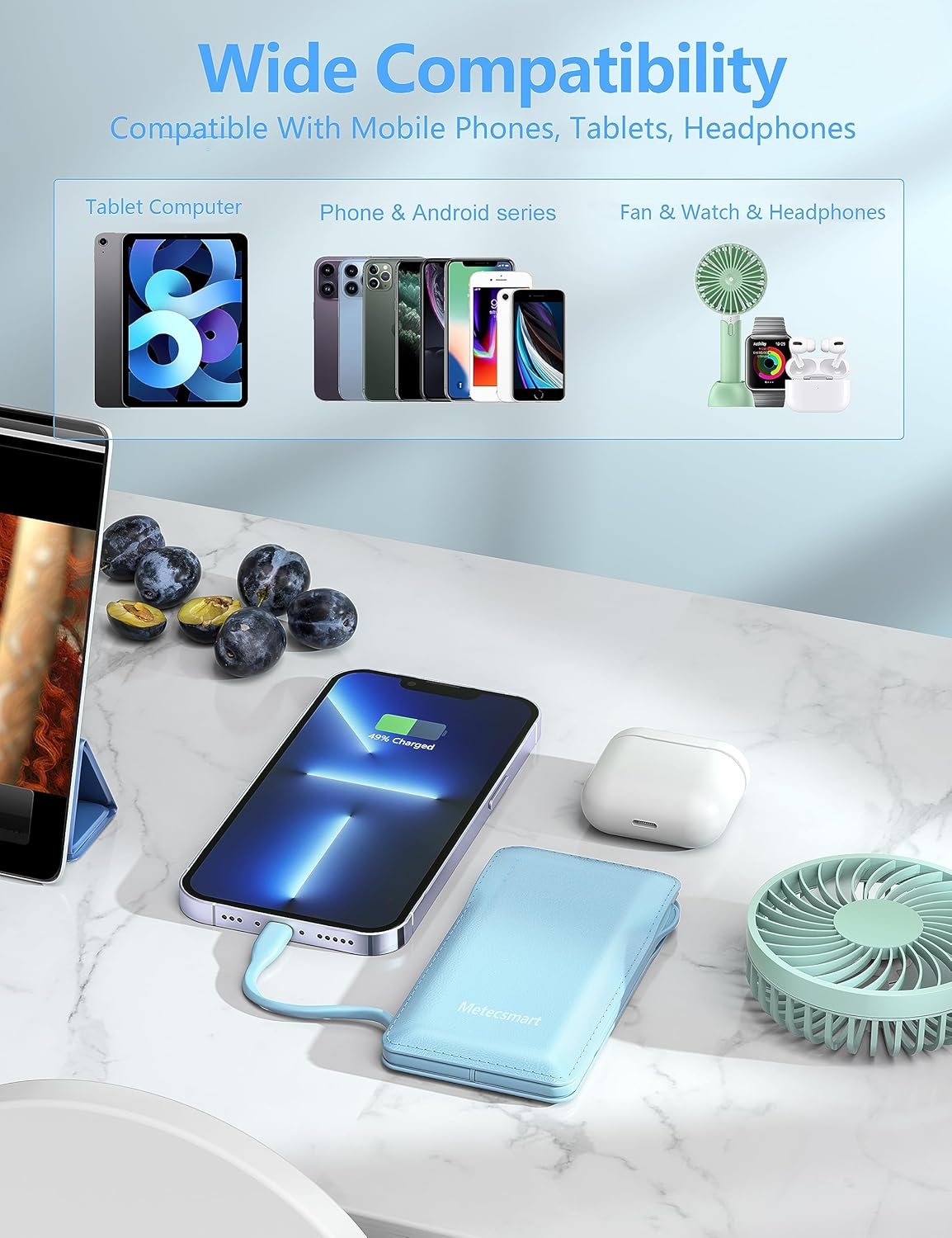 - So convinient! Using the built-in cables to charge, the portable battery charger is compatible with IOS smartphones and all USB-C devices and smart devices. For example, one built-in IOS cables compatible with iPhone 14/13/12/11/X/XS/8/7/6/5/5S series, iPad series, the other one built-in USB-C cable compatible with iPhone 15, iPhone 15 Plus, iPhone 15 Pro, iPhone 15 Pro Max, Samsung S23,S22,S21,S20 series and other cell phones