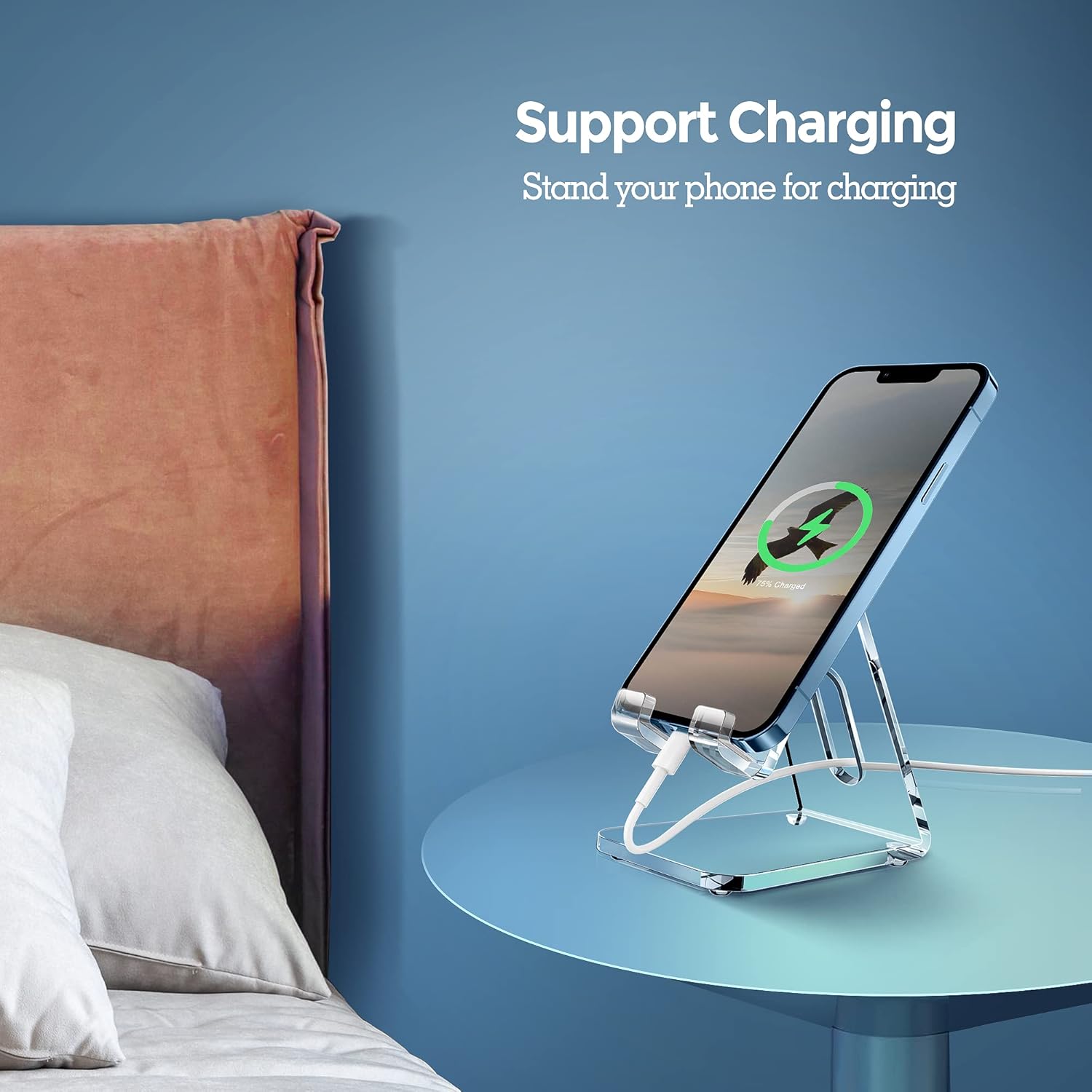 - More Thicker and Sturdy: Using 5mm high quality acrylic material, stronger and excellent durability. Hands-free, make it possible to play games, use Facetime and Youtube while charging. Play a good role in your office, kitchen, nightstand, dining table.