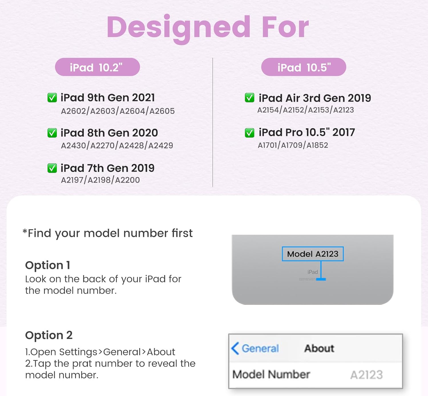 - ✅【IPad 10.2/10.5 inch Keyboard Case Compatibility】❗❗No pen or charger included!❗❗The iPad keyboard case is designed for new iPad 9th 2021 (Model number: A2602/A2603/ A2604/ A2605),8th 2020 released (A2430/A2270/ A2428/ A2429), iPad 7th Generation 10.2 inch 2019 released (A2197/A2198/A2200), iPad Air 3 10.5" 2019 released (A2152/A2123/A2153/A2154) and iPad Pro 10.5 inch 2017 released (A1701/A1709/A1852). Please check the back bottom of your iPad to find the model number.