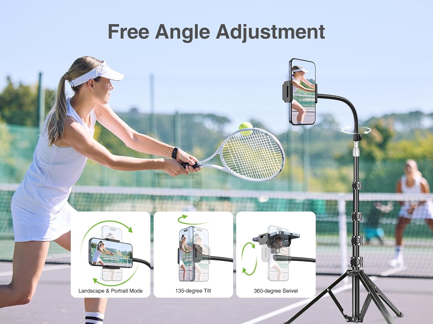 - 80-in tall cell phone tripod -- Adopts the flip-locks structure, this tripod for cell phone is super easy to fold down or fully extend. Its ability to reach up to 80 inches allows for shots that are unattainable with other tripods. Moreover, the 15-in flexible gooseneck gives you a total freedom to shoot from varying heights, even at ultra-low angle or overhead, helping your phone get hard-to-reach points and challenging angles easily.