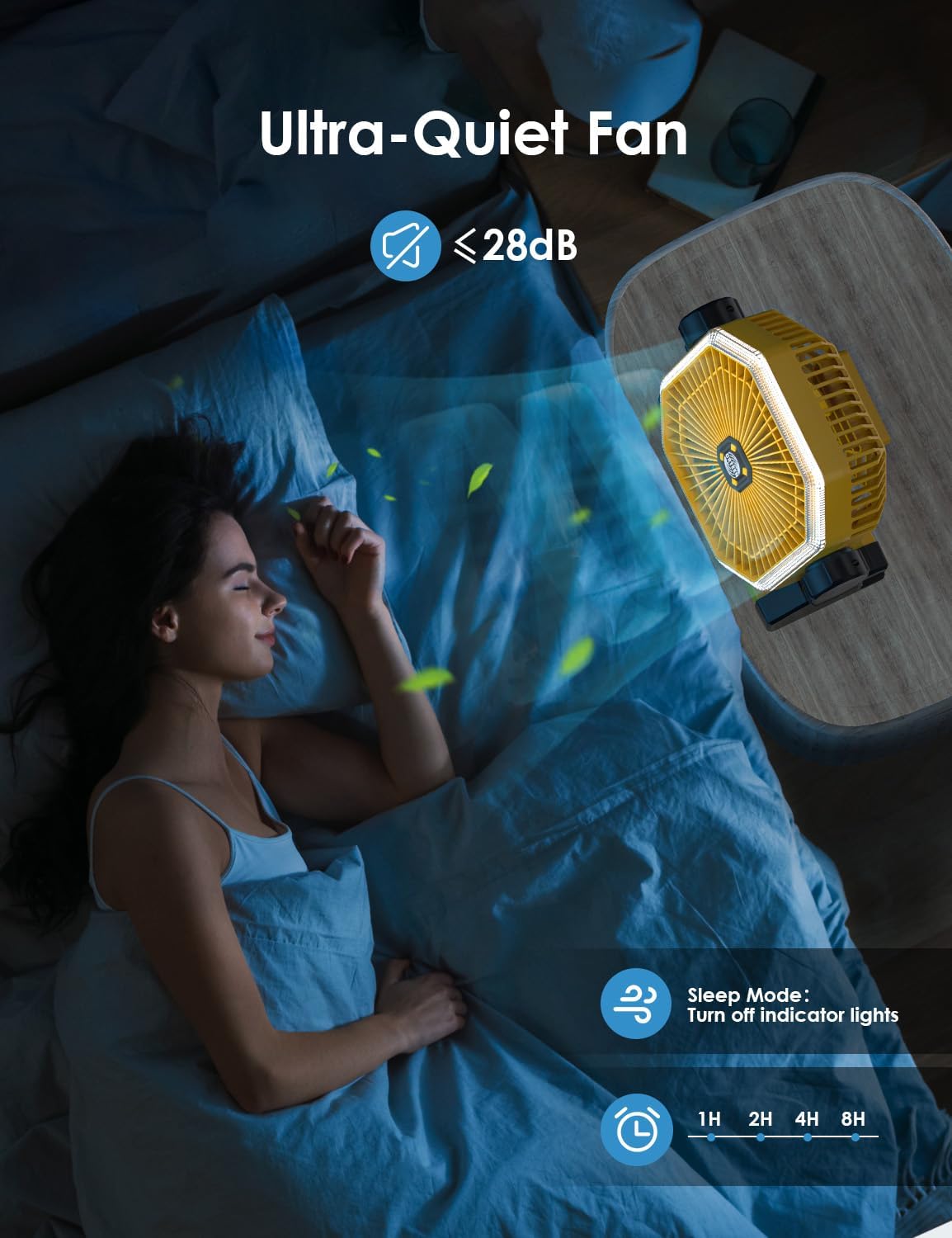 - USB FAN CAMPING WITH SLEEP TIMER: This portable fan for camping has a sleep timer to help you set the working time, The rechargeable camping fan doesn't have to run all day or all night (can be timed to 1H, 2H, 4H, 8H), Also you can set the sleep mode will turn off all the lights to help keep it dark and better sleep, Thanks to its powerful and super quiet feature, This battery operated fan camping runs with the lowest white noise (<28db) Let you get maximum comfort.