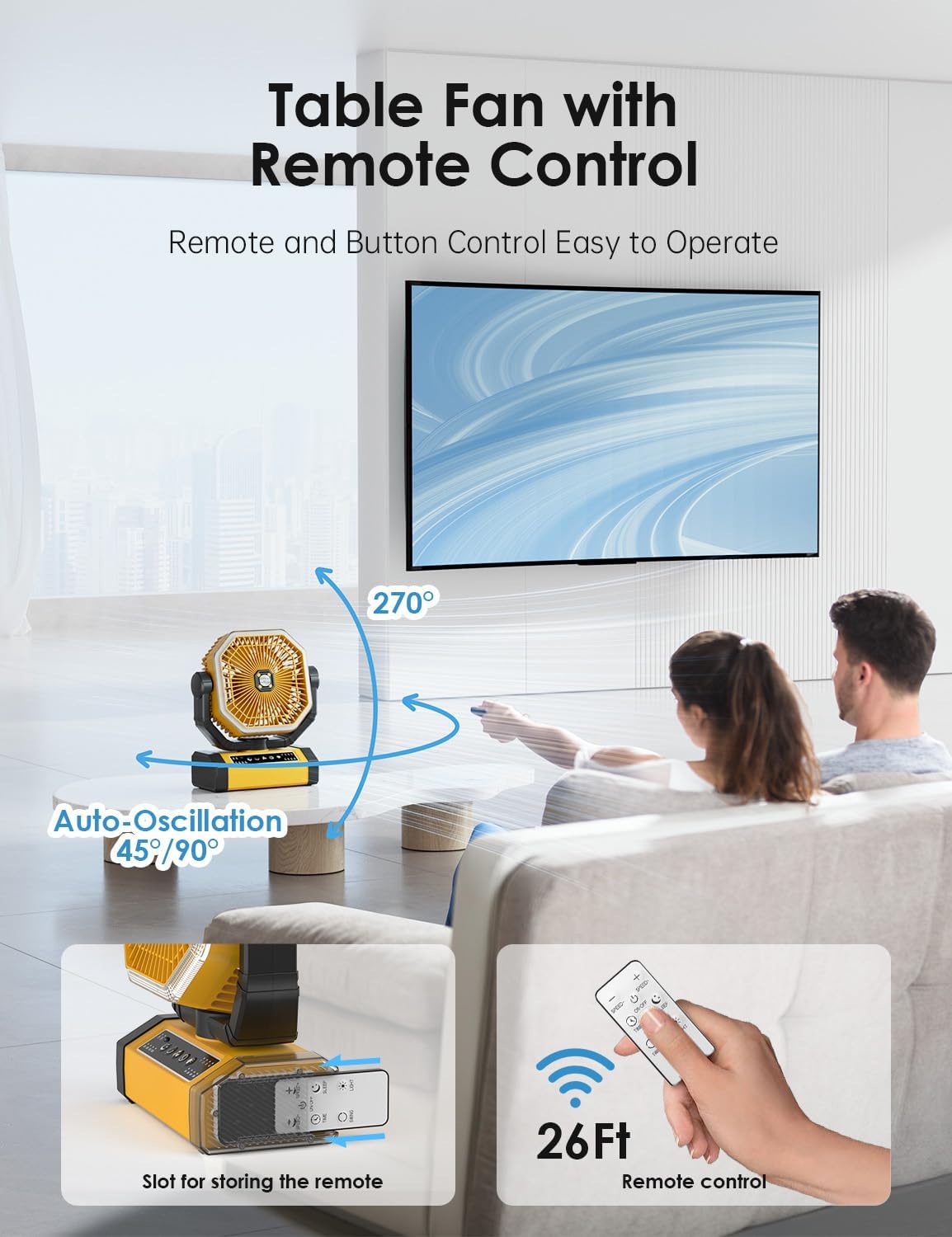 - RECHARGEABLE FAN CAMPING & SHAKING & REMOTE:This fan battery operated has 90° or 45° automatic swing, 270° swivel head, which can be rotated at will to improve comfort. In addition, the battery powered fan for camping is equipped with a remote control, so you can easily control the fan with the remote control or buttons within 26 feet. The remote control can be stored in the slot on the side of the base to avoid loss. Note: Please remove the insulating strip on the remote control before use.