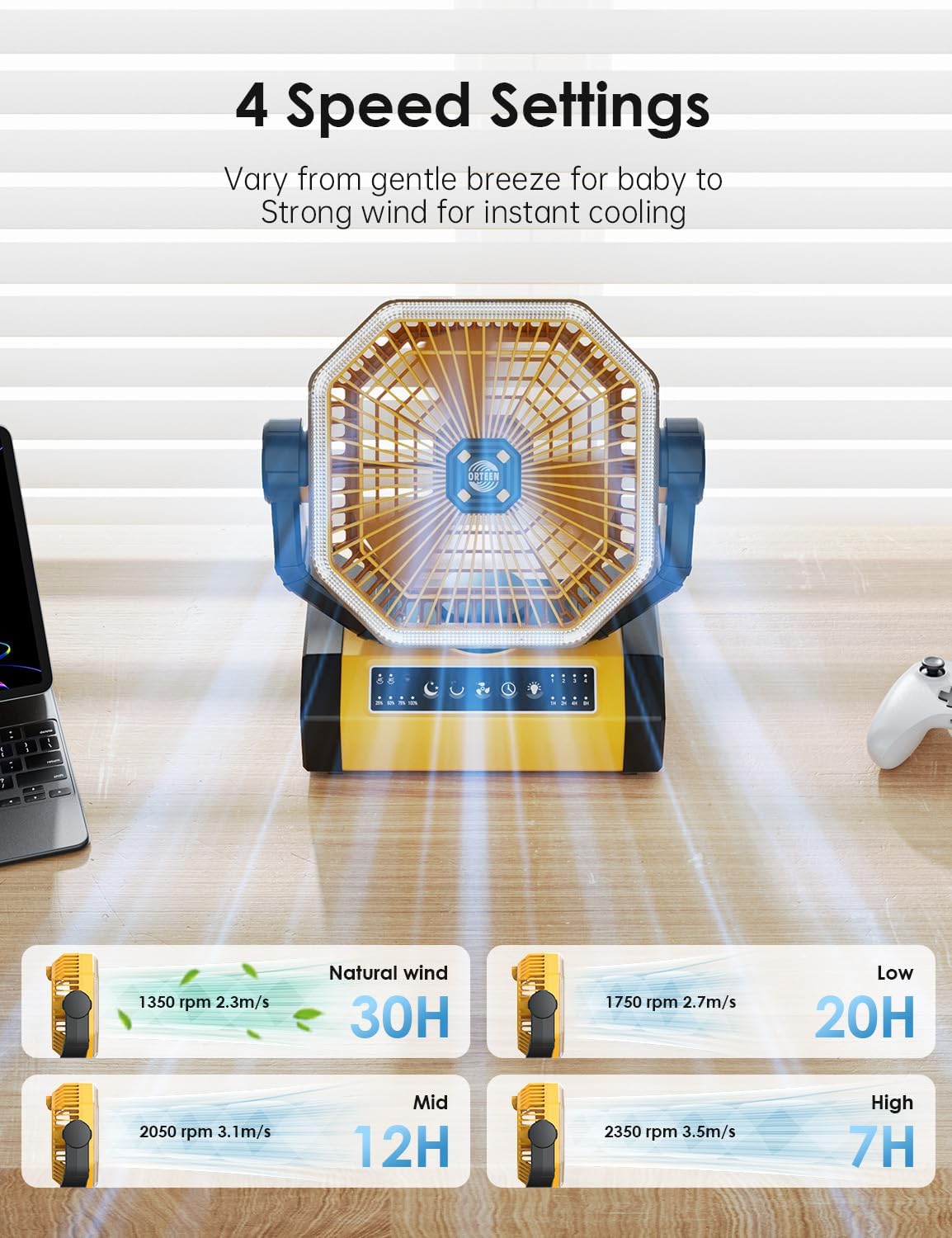 - PORTABLE BATTERY FAN WITH Light & Hook: This portable camping fan offers 12 LED beads, 3 dimmable brightness functions for different occasions. Great portable fan for bedroom, Office, Camping, RV, Power Outage, Rtc. The 2-in-1 camping fan battery powered has a 360° rotating hidden hook so you can hang the fan up and adjust the right angle. In addition, it is also suitable for use indoors as a large battery operated fan. This would be a great gift for your family and friends.