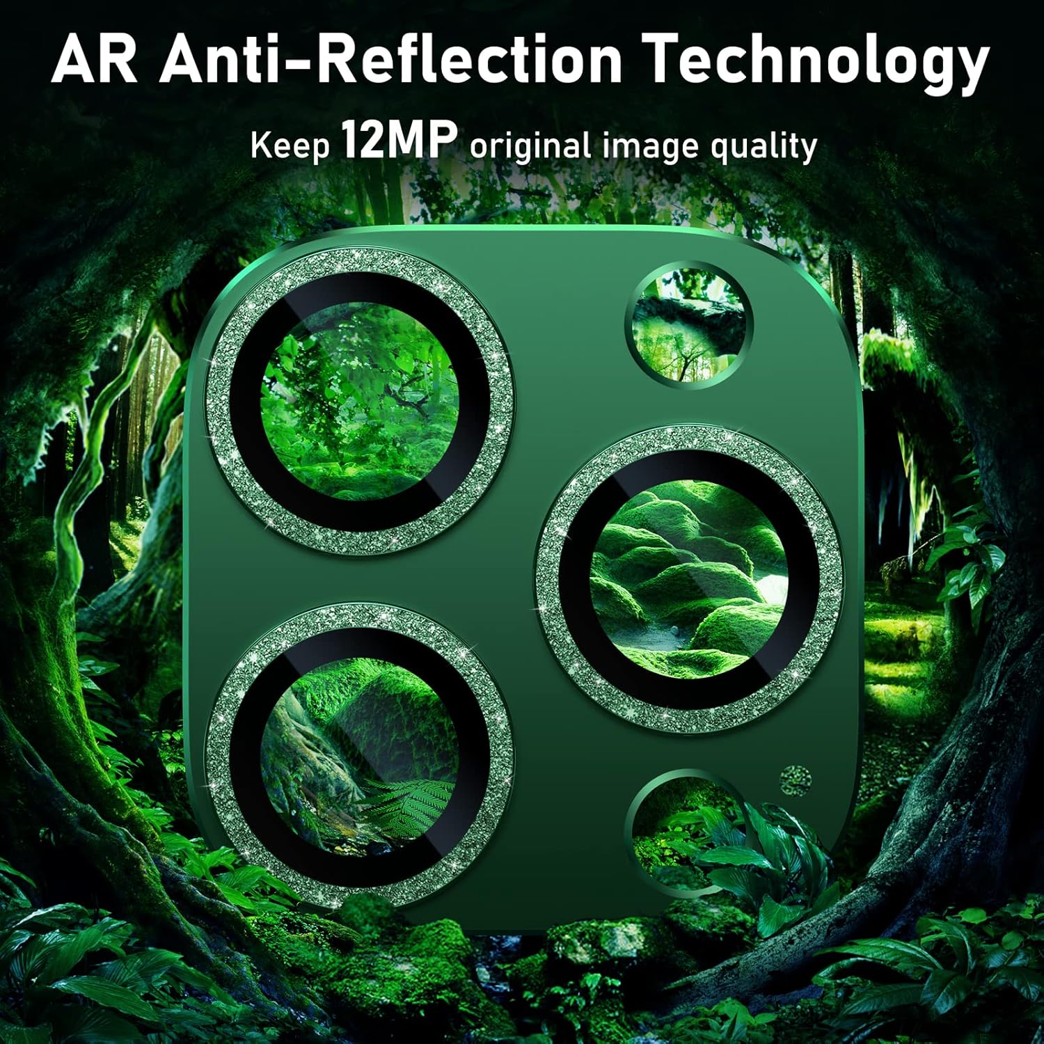 UniqueMe for iPhone 13 Pro/iPhone 13 Pro Max Camera Lens Protector, [Strong Drop Protection] [Not Easy to Fall-off] Metal Ring Tempered Glass Rear Camera Screen Cover - Alpine Green (Bling Circle)