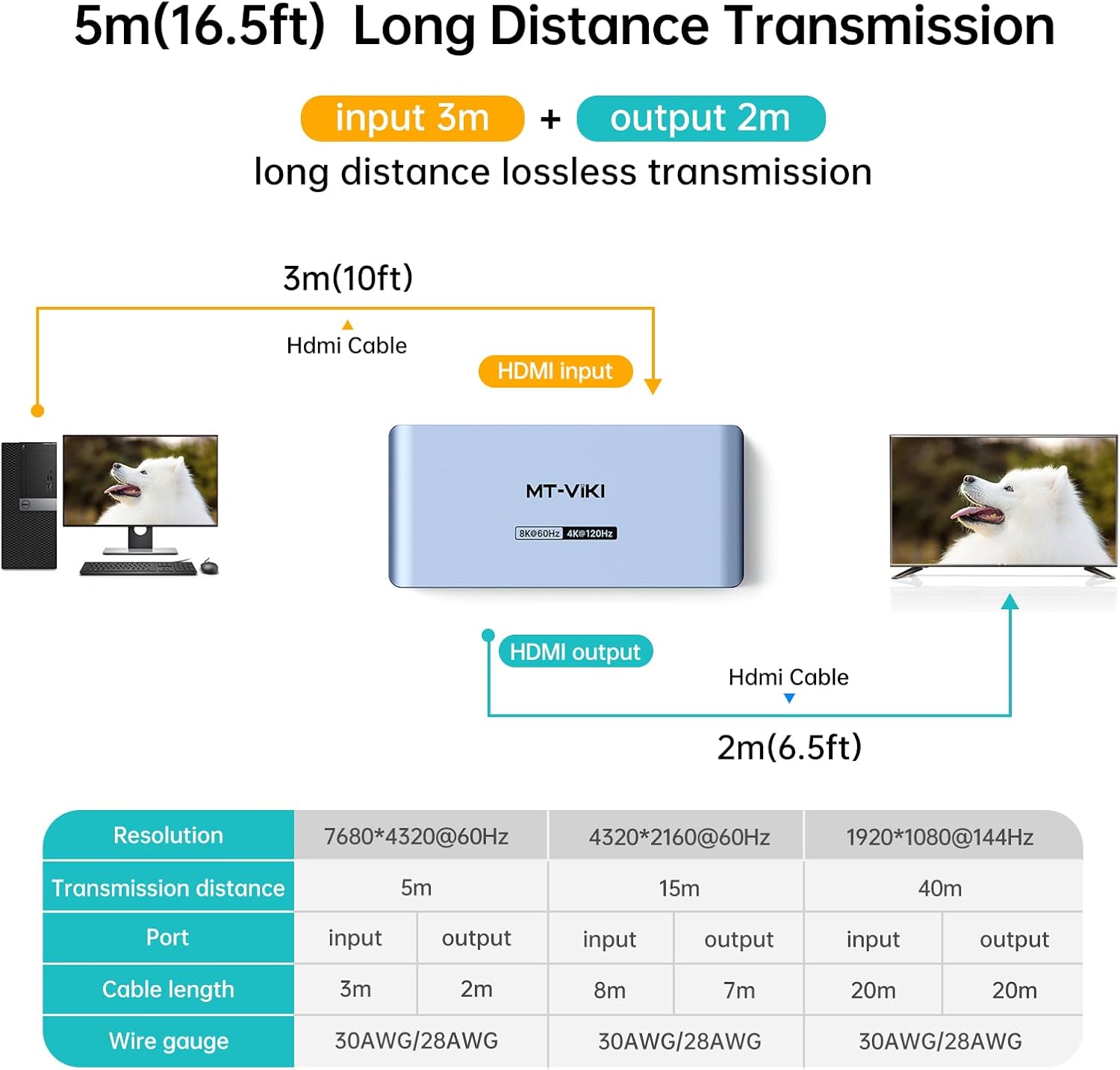 - Cascade Connection: This 8K HDMI splitter 1x4 supports cascade, one to multiple, Signal source transmission support up to 26ft (Input 16 ft and output 10ft ).