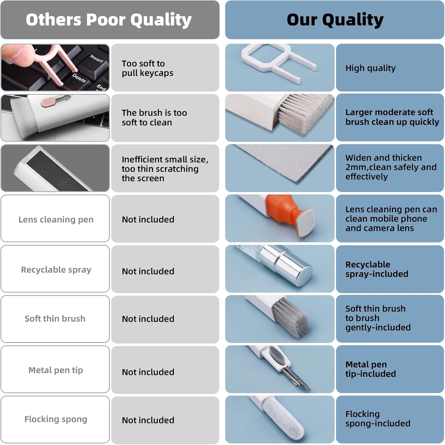 - 【UPGRADED LAPTOP CLEANING KIT 】 The macbook cleaning kit computer screen cleaner comes with a number of accessories including a retractable large brush, polishing cleaning cloth X 2, keycap puller, metal pen tip, flocking sponge, thin soft brush, soft plastic lens cleaning pen, 5 replacing cloth, large cleaning microfiber cloth. You deserve the comprehensive computer cleaning kit keyboard vacuum at a low cost