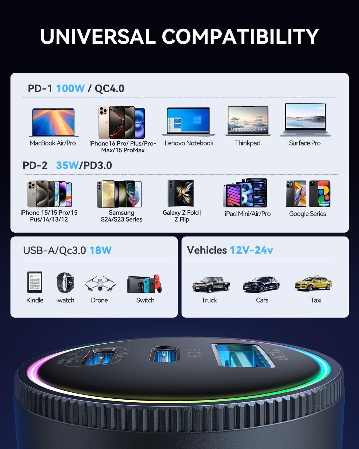 - 【100W Fast charging USB C Cable & Stylish Rainbow LED Lights】The 2025 upgraded car phone charger includes a 4-foot high-speed 100W USB C to USB C cable, so you no longer need to carry extra cables. It’s perfect for iPhone 16 series and supports PD 4.0/3.0 and QC 5.0/4.0 fast charging. The iphone 15 car charger also features soft, colorful LED ambient lights, making it easy to locate the charging port in the dark and enhancing your driving experience