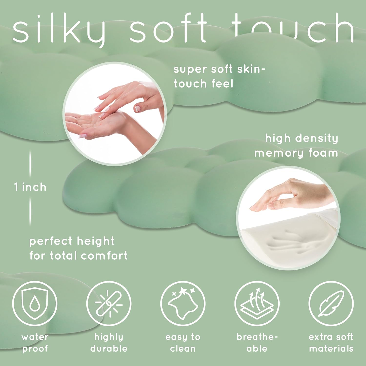 - Cloud Soft Comfort – The new pastel green cloud wrist rest by Create-ables prioritizes comfort and quality. The outer material of the cloud mouse pad with wrist rest is milk-silk – a soft, luxurious and biodegradable fabric that is similar in texture to silk and cashmere. Milk-silk is skin-friendly (unlike PU leather made from oil and chemicals) and more durable than most other fabrics