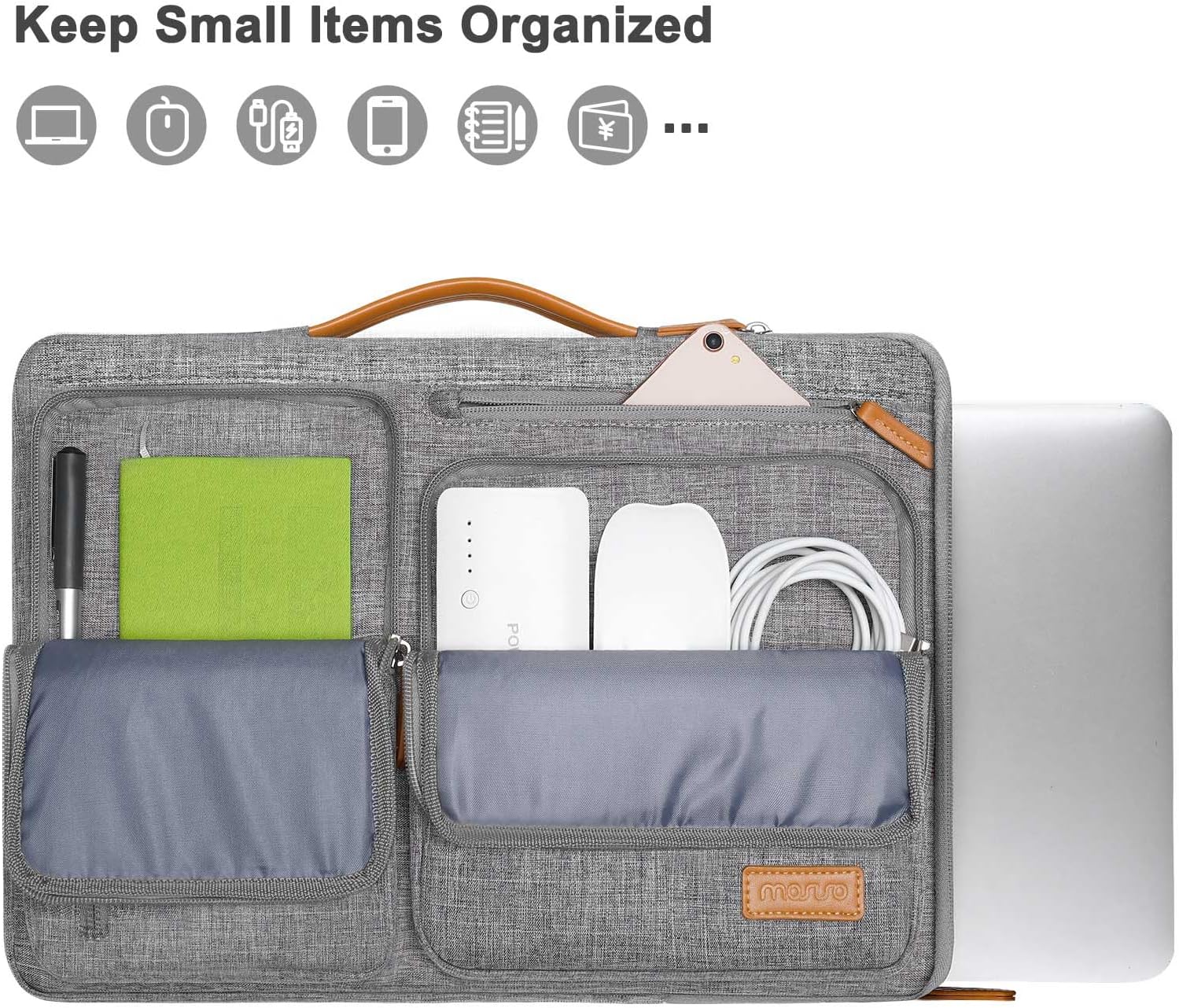- 360 degree all around protective reinforced interior edge briefcase carrying case bag protect your laptop from any accidental dropping. Extendable handle design makes it to carry your laptop around in comfort, you can also tuck away the handle. Side opening zipper design, avoid accidental dropping of your laptop while carrying. 4 front zipper pockets provide enough space to keep mouse, earphone, pens and notepads, offering added convenience.