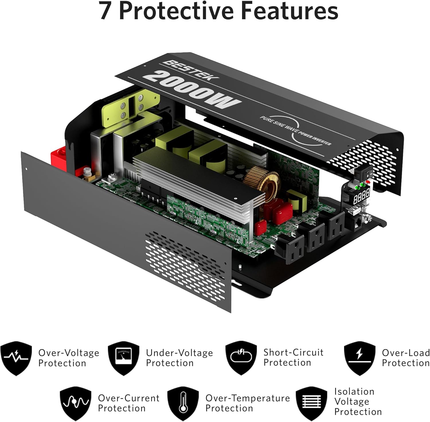 - [Comprehensive Protection]: At BESTEK, we attach great importance to the safety of our products. This 2000W pure sine wave inverter has seven main protection measures: over voltage, under voltage, short circuit, overload, over current, temperature and voltage isolation protection to ensure the safe operation of the product.