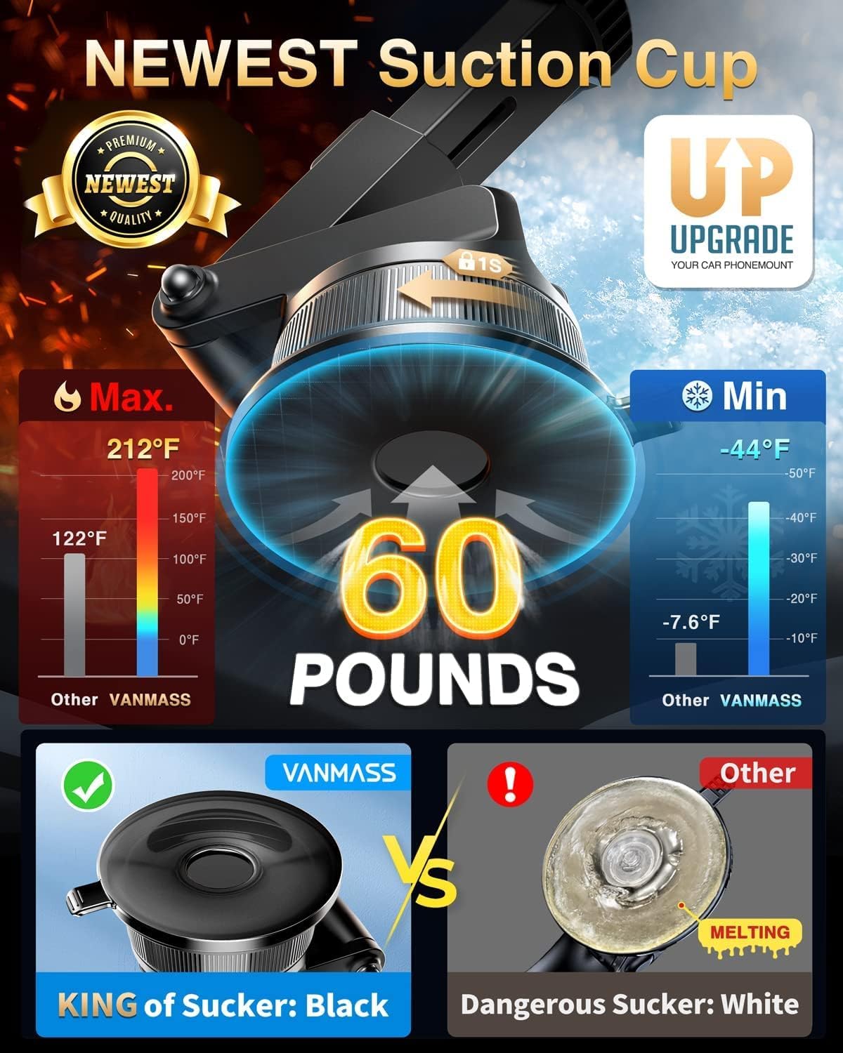 - 【🥇BEST Newest Car Phone Holder】VANMASS's best car phone mount with the highest rating! Preferred by 3,500,000+ Customers; Designed by world-class professional team; enjoy EUIPO Patent (No.007708805-0001), Military-grade certificate (No. GZMR220601855501), CP65/REACH/ROHS; 4,000+ kinds of material selection, 500+ suction cup upgrade designs, and 20,000 miles of road tests; giving birth to the best combo of the Flagship&Classic hoolder with newest suction cup;