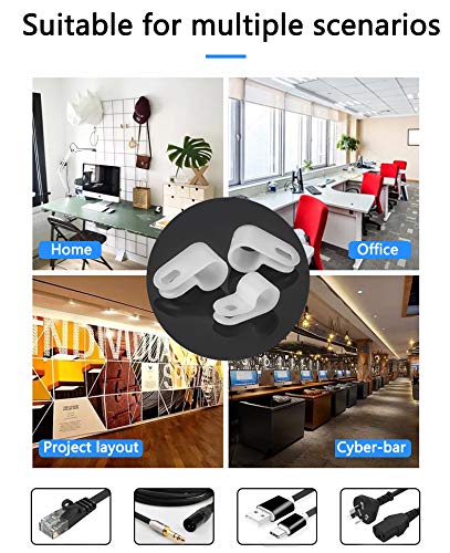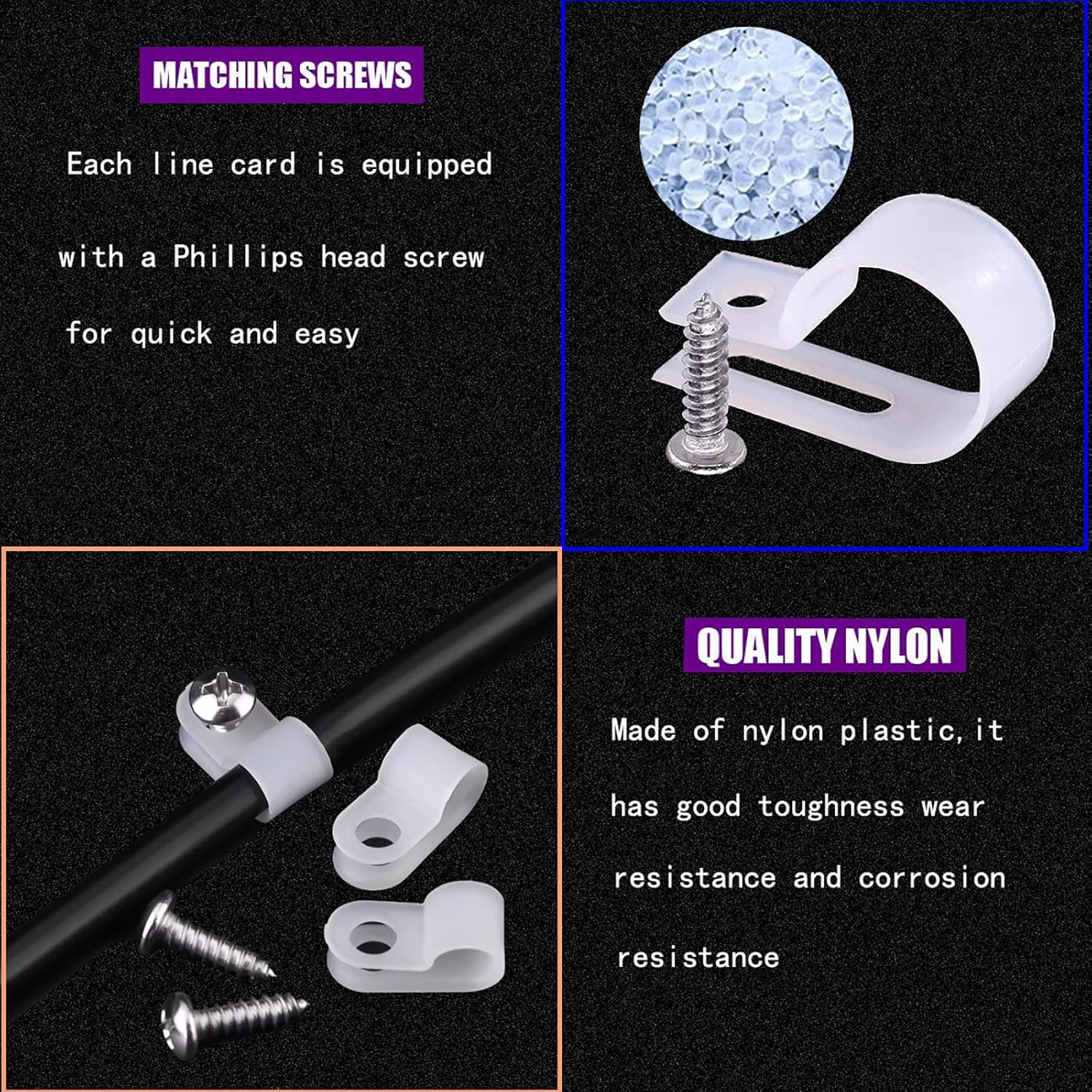 - 【Best Combination】--- There are 150 pieces screws and 150 pieces nylon R-type cable clamp in 5 sizes:1/4" 5/16" 3/8" 1/2" 3/4". These sizes contain almost the 5 most commonly used sizes in our life,such as TV cords, routing cables, snowmobile wires, LAN cables, Ethernet cable, computer and electrical power cables , desk wall cables.