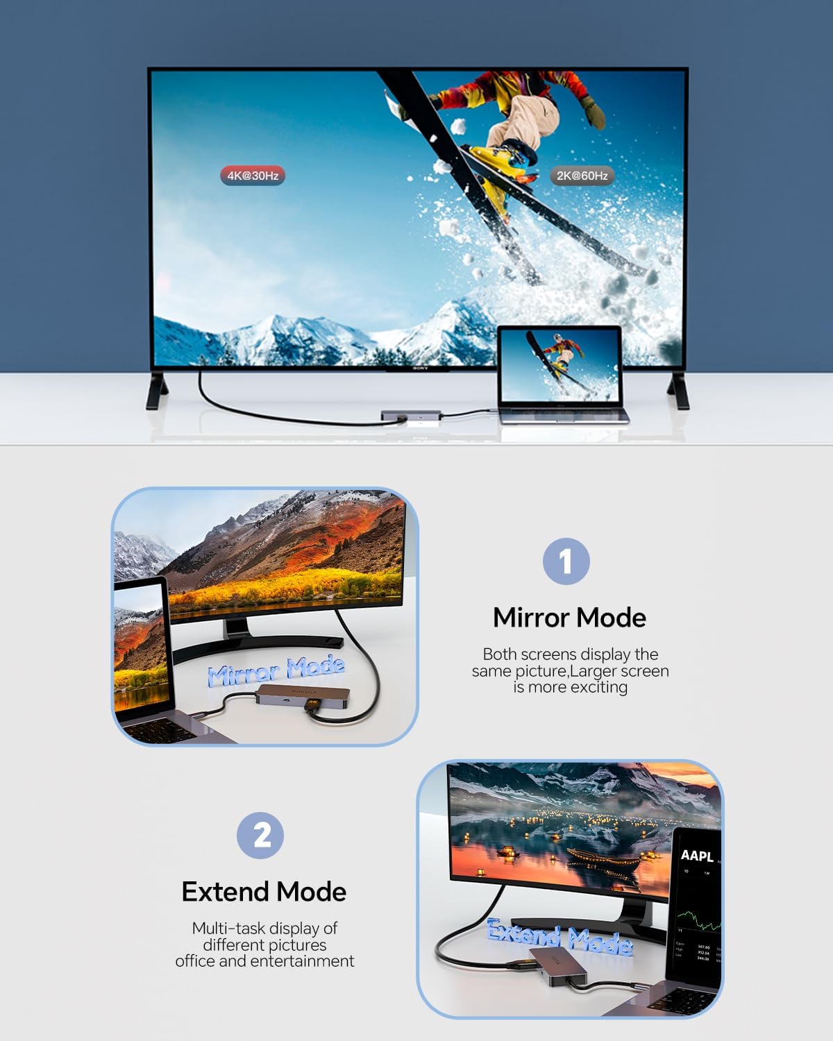 - 【4K USB C to HDMI】 Our USB C docking station provide Crystal-clear 4K HDMI Output make your life more colorful - mirror or extend your screen with the USB C adapter's HDMI port and directly stream 4K UHD or full HD 1080P video to HDTV, monitors, or projectors for a cinema-like visual feast.