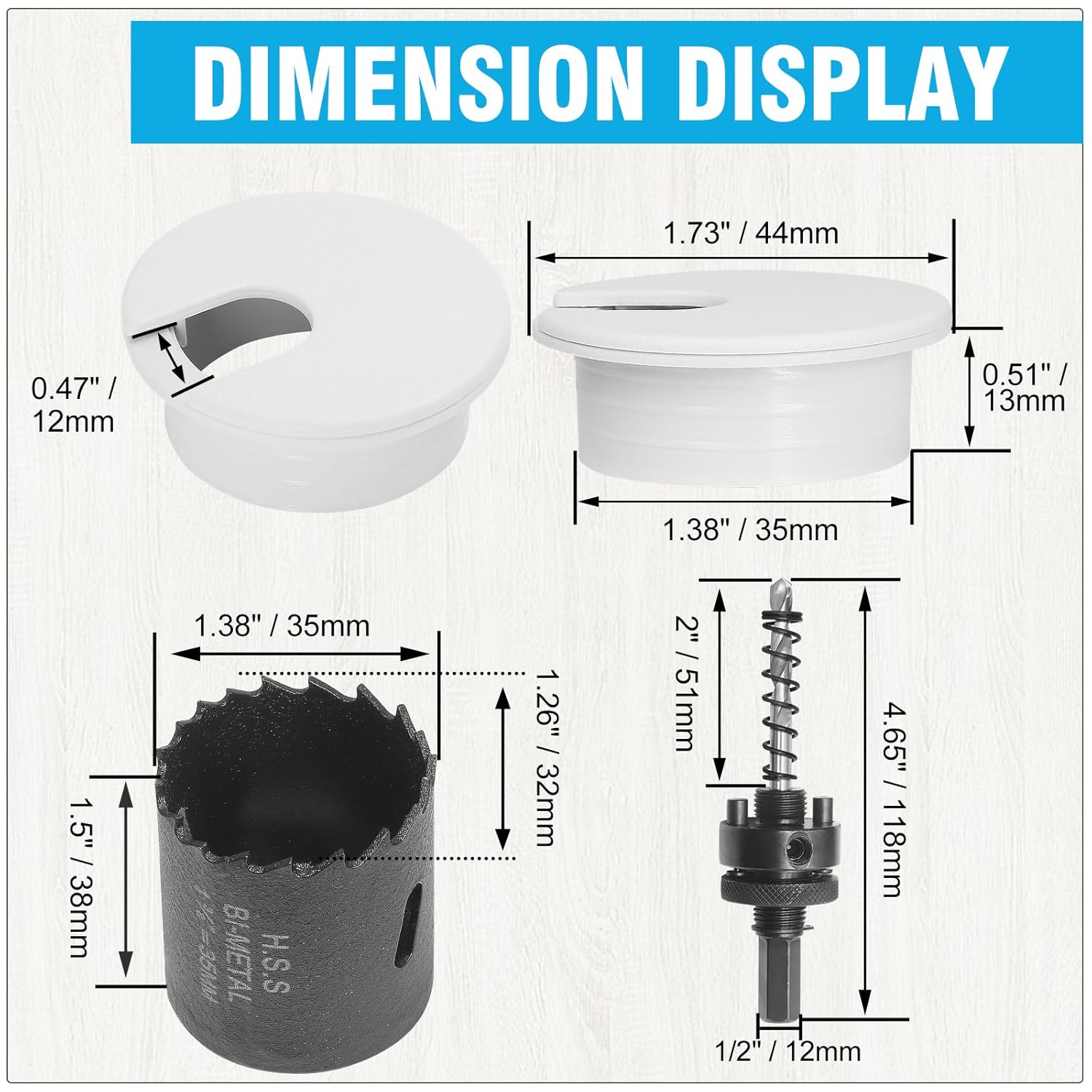 - DELIGHTS PACKAGE -- Your package includes 6 x 1-3/8" desk grommets, 1 x 1-3/8" hole saw. Useful Tips: 1.Start by vertically and slowly cutting a slot, 2.Maintain even pressure while cutting, and keep your pace slow to avoid damaging the surface, 3.Periodically clean the desk grommet area to prevent accumulation of debris.