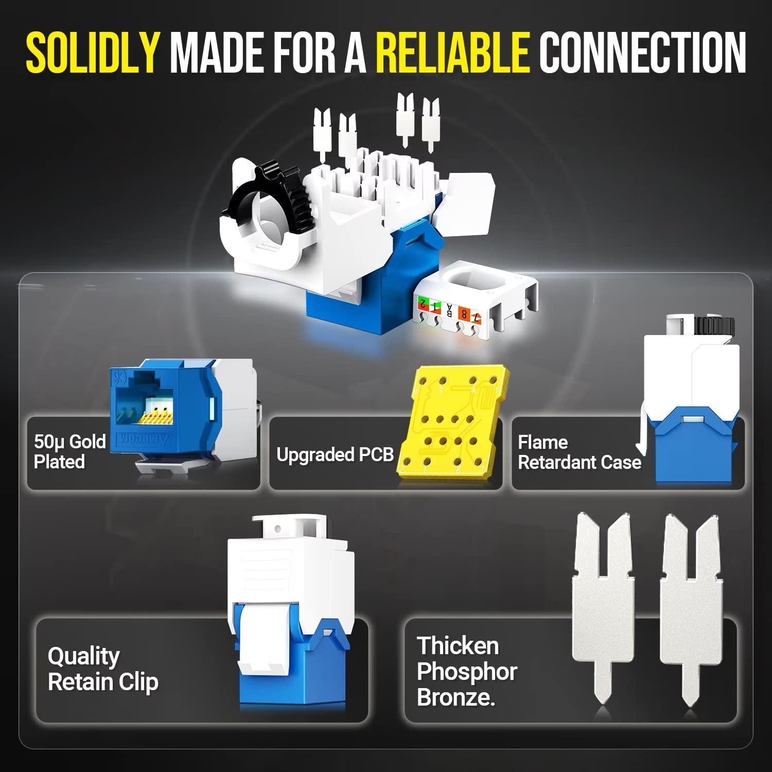 AMPCOM CAT6 RJ45 Keystone Jack - Reusable UTP Ethernet Wall Jack with Adjustable Ratchet Lock Design, No Tool and Zip Tie Required - 50u Gold Plated - Blue (12-Pack)