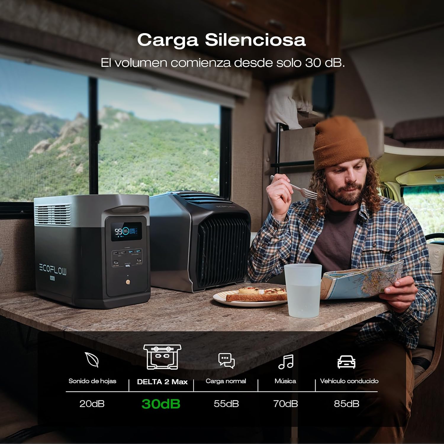 - Quiet Charging. With volume levels starting from only 30 dB, DELTA 2 Max outdoor generator is perfect for powering devices overnight without disturbing sleep. Use the EcoFlow app to manage your energy use, set automations, and more.