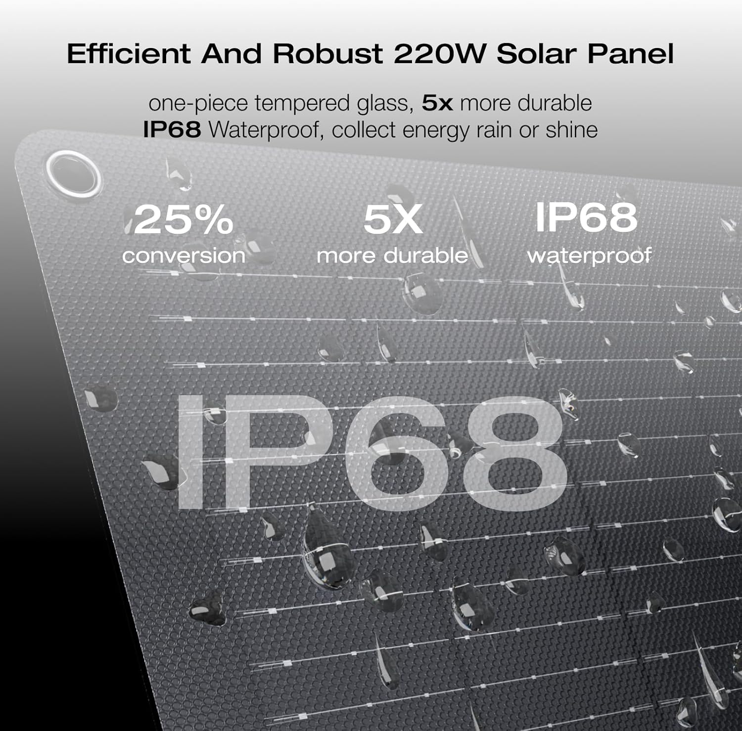- [Lightweight & Waterproof] 220W double-sided solar panel is foldable and compact, weighing only 15.4 lb, making it easy to carry or store. With a thin tempered glass design, it's 5 times more durable than similar solar panels. Its IP68 rating makes it both water-resistant and dustproof.