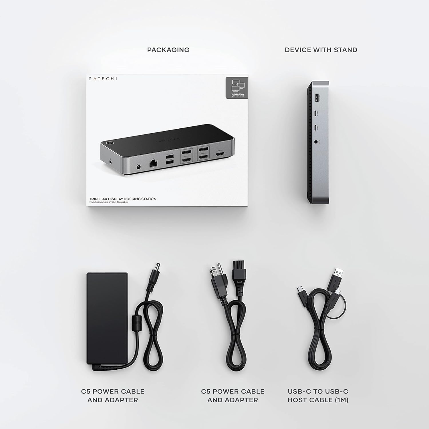 - What's Included - The Satechi Triple 4K Display Docking Station comes with a 130W power adapter, USB C to USB C cable, USB C to USB A adapter, customer support, and a user manual for easy installation. Satechi products are covered by a 2-year limited warranty against defects in materials and workmanship under normal use.