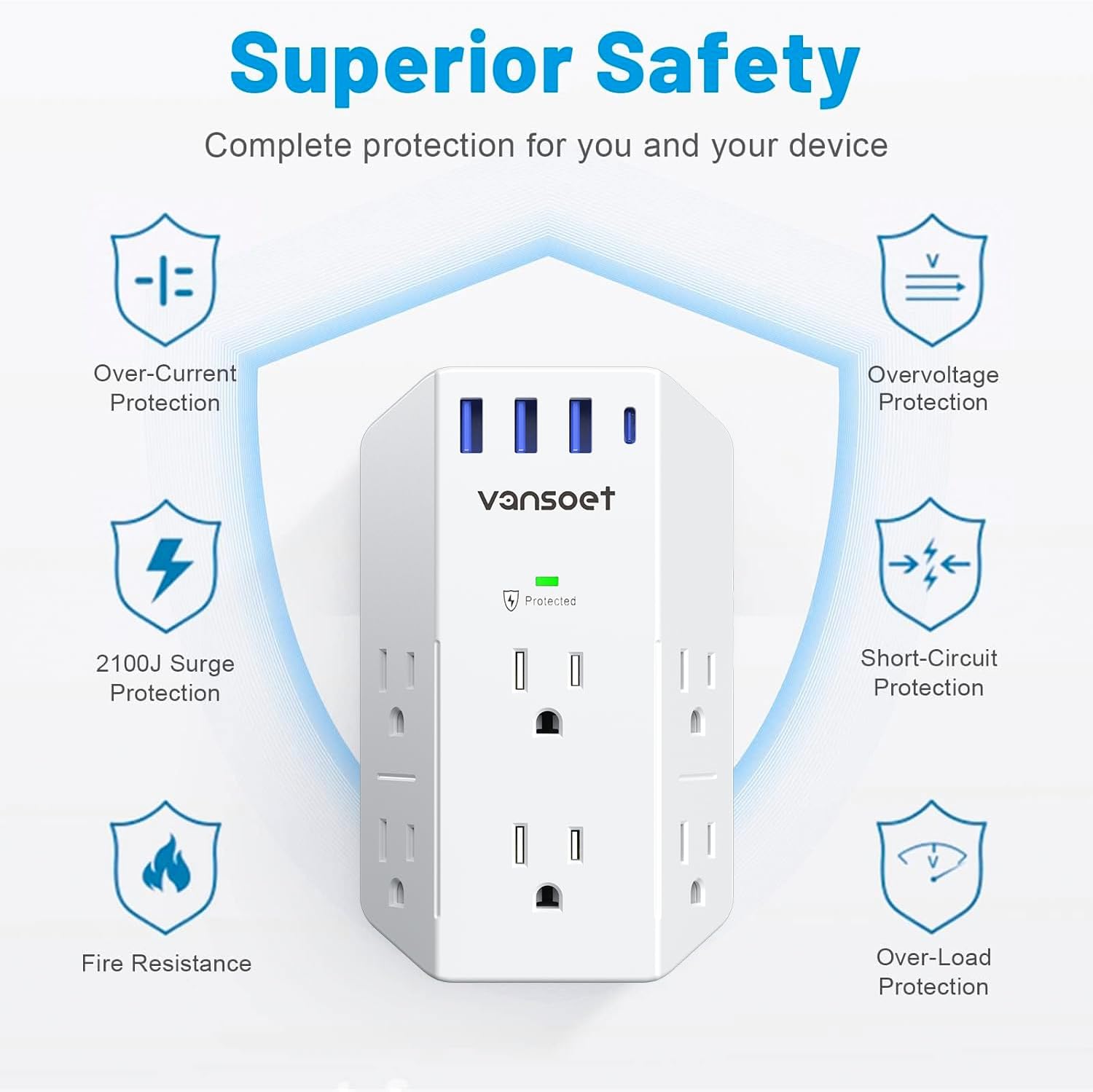 - Comprehensive Safety: Our multi outlet plug is made of durable UL94 V-0 PC+ABS housing, which can provide overload protection, short circuit protection, overcurrent protection, overvoltage protection and overheating protection. Complete protection for you and your device.