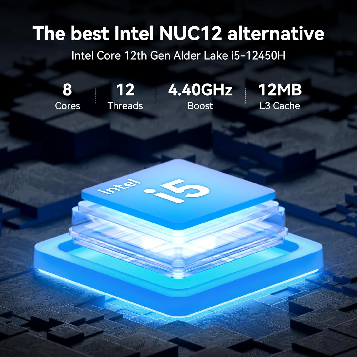 - 【Excellent Performance】GEEKOM NUC 12 Mini IT12 Mini PC is equipped with the latest 12th Gen Intel Core i5-12450H processor (8 cores, 12 threads), 12MB cache, up to 4.40 GHz. It is powerful enough to support the heaviest applications such as home servers, school education, internet browsing, business offices and billboards.