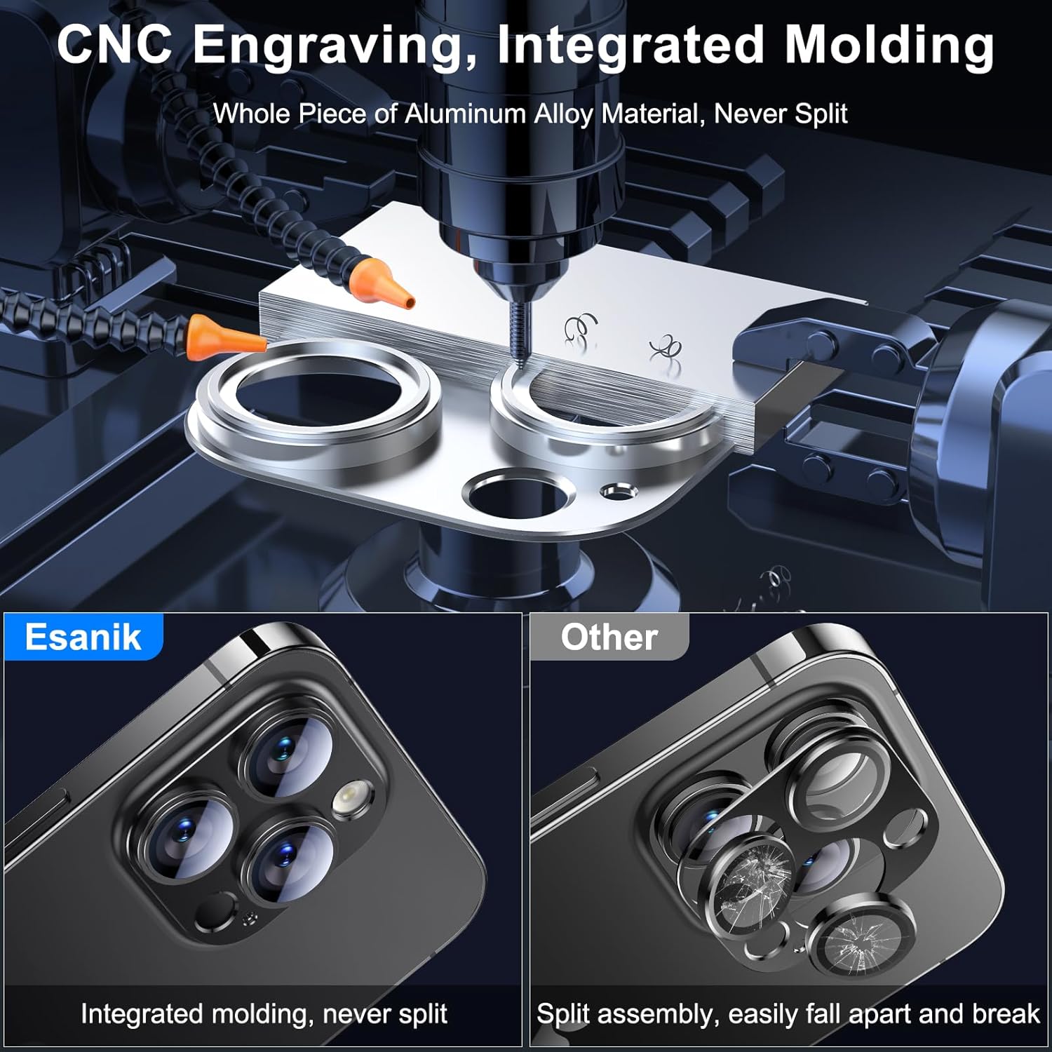 - 【CNC Engraving & Integrated Molding】 Esanik Upgrade Version iPhone 14 pro max / iPhone 14 Pro Cam Cover is precisely carved from whole piece of high-quality aluminum alloy, firm and long lasting. Bid farewell to the split and falling apart issues resulting from the conventional split assembly process.