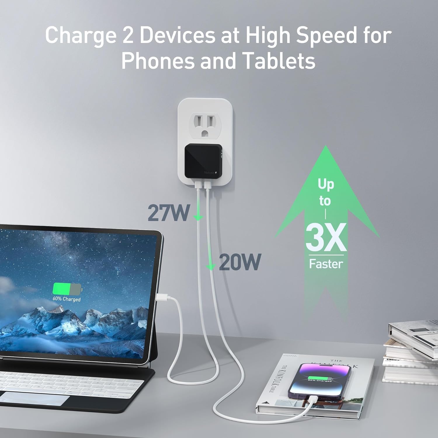 - Charge 2 Devices: Dual usb c ports wall charger offer 27W and 20W charging so you can power up your phone and your iPad at the same time
