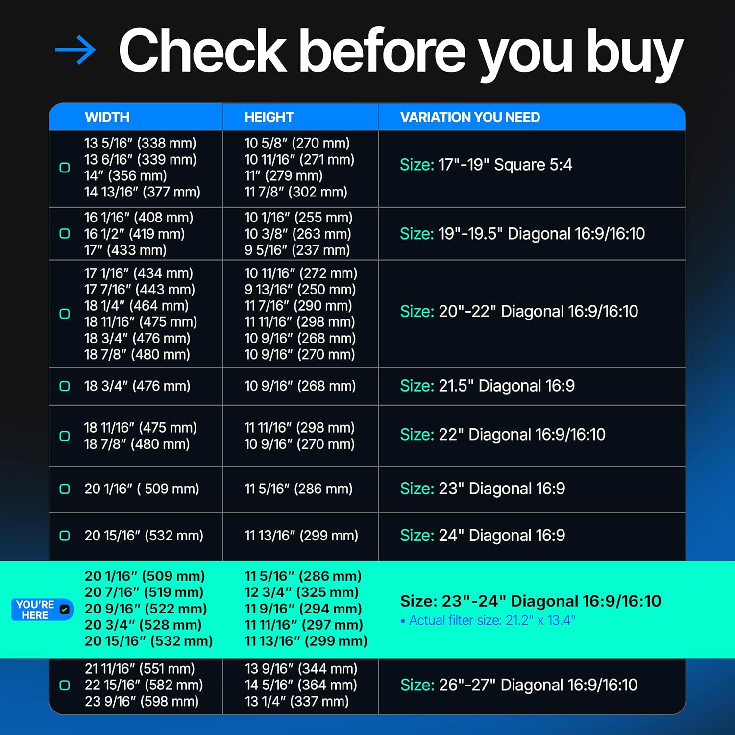 - Ideal Fit: Privacy screen protector fits screens sizes of 23", 23.6", 23.8", 24". Actual filter size: Width: 21.2 inches (541mm), Height: 13.4 inches (342mm). The filter enhances visual clarity and protects the eyes