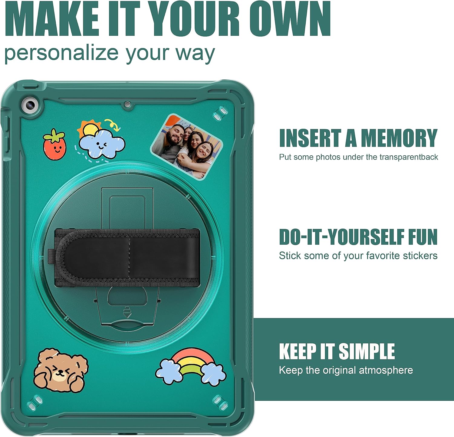 - FEATURES: ①Built-in Kickstand is 360 degree rotating, you can adjust your 10.2 inch iPad to whatever angle you want, perfect for watching videos and chatting; ② Adjustable velcor hand strap allows big hand and small hand, perfect for kids and adults. ③Adjustable and detachable Shoulder belt is very convenience, safe and fashion you can carry tablet with should belt wherever you want. ④To easily pull out and store your Apple pencil, there is a built-in elastic pencil holder.