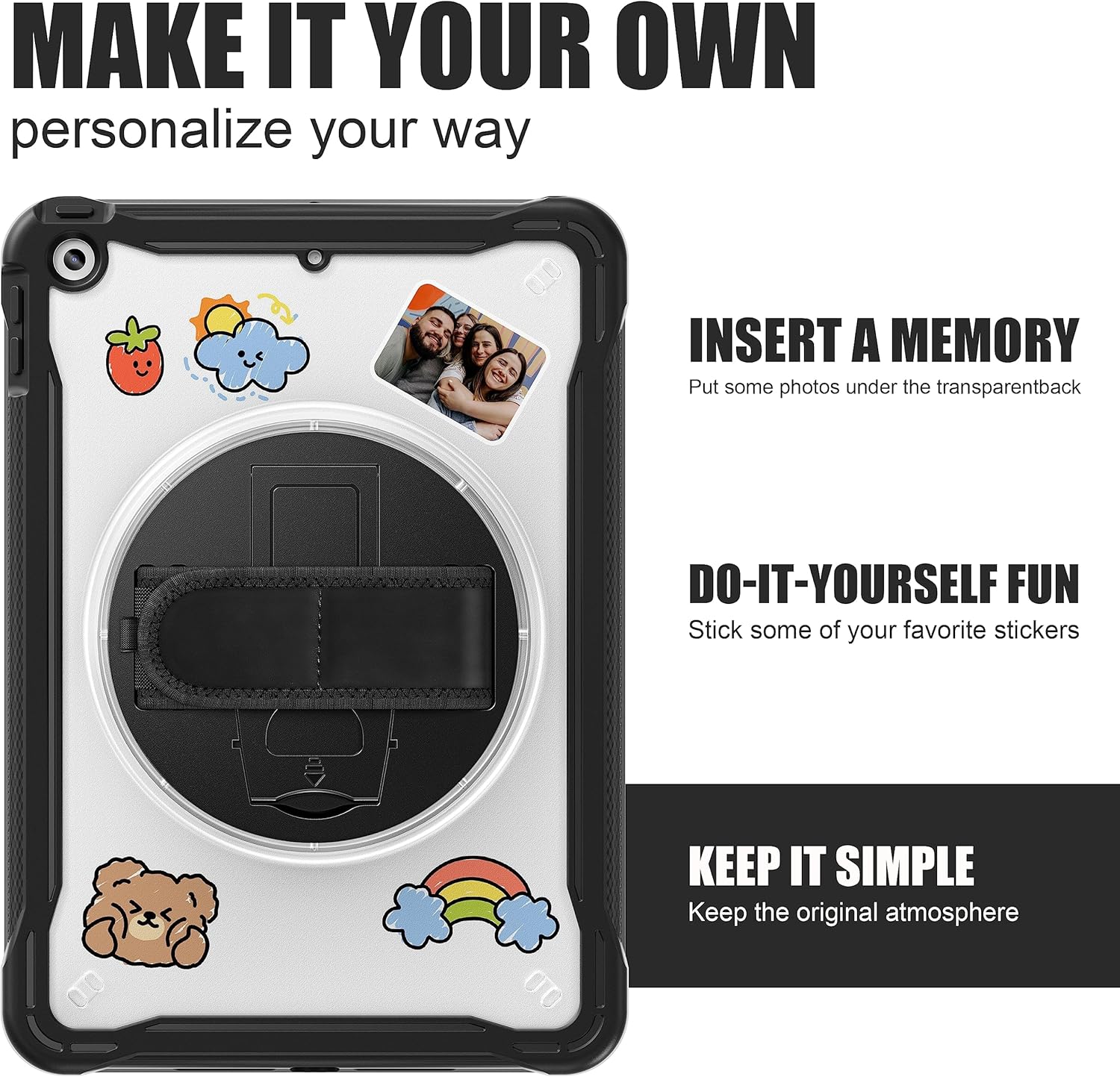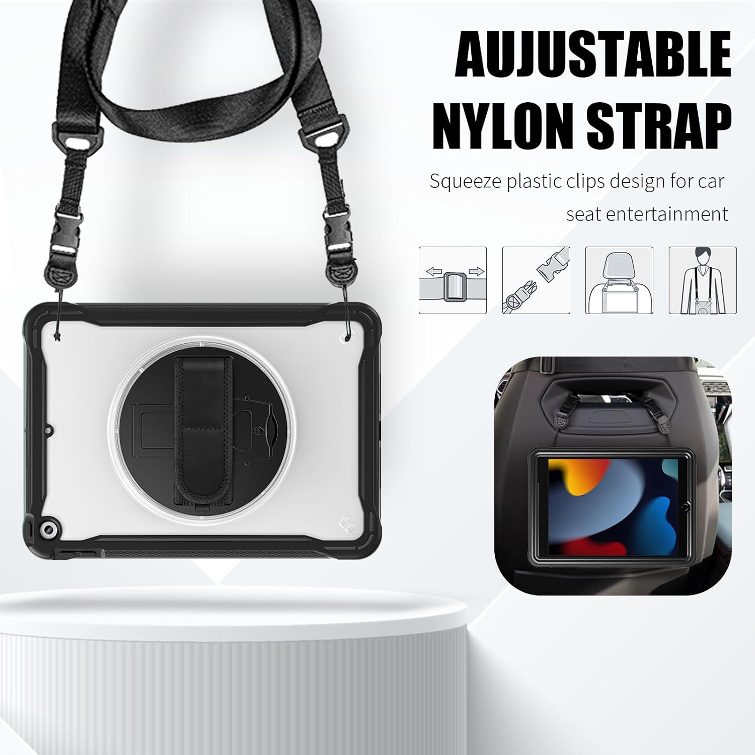 - FEATURES: ①Built-in Kickstand is 360 degree rotating, you can adjust your 10.2 inch iPad to whatever angle you want, perfect for watching videos and chatting; ② Adjustable velcor hand strap allows big hand and small hand, perfect for kids and adults. ③Adjustable and detachable Shoulder belt is very convenience, safe and fashion you can carry tablet with should belt wherever you want.④To easily pull out and store your Apple pencil, there is a built-in elastic pencil holder.